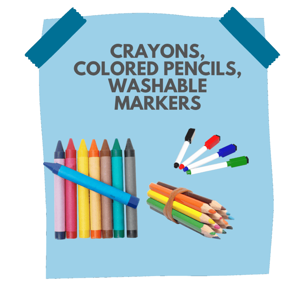 Crayons, colored pencils, washable markers