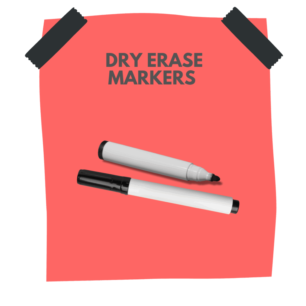 Dry erase markers (black + colors, low odor)
