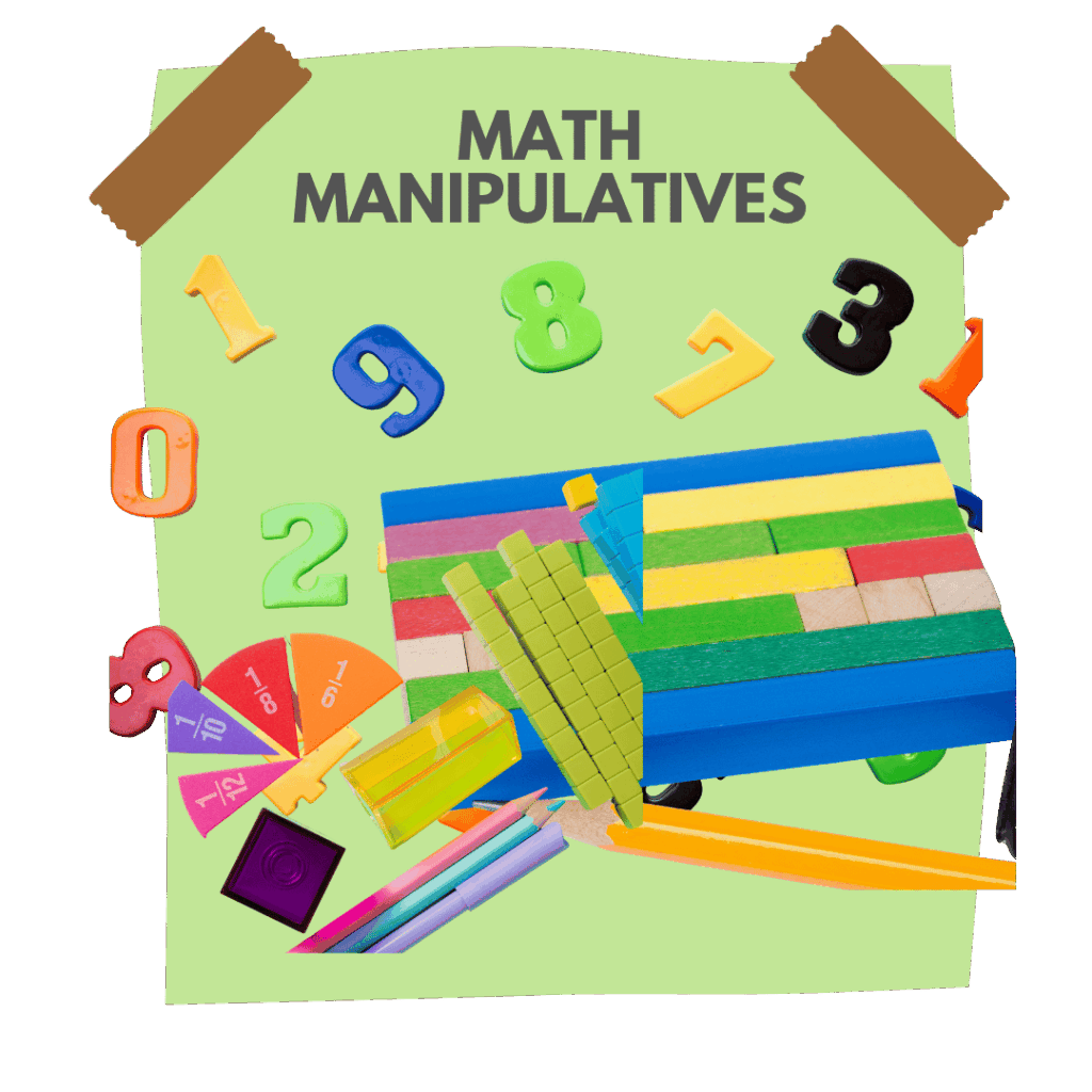 Math manipulatives (counters, cubes, base-10 blocks, dice, number line)