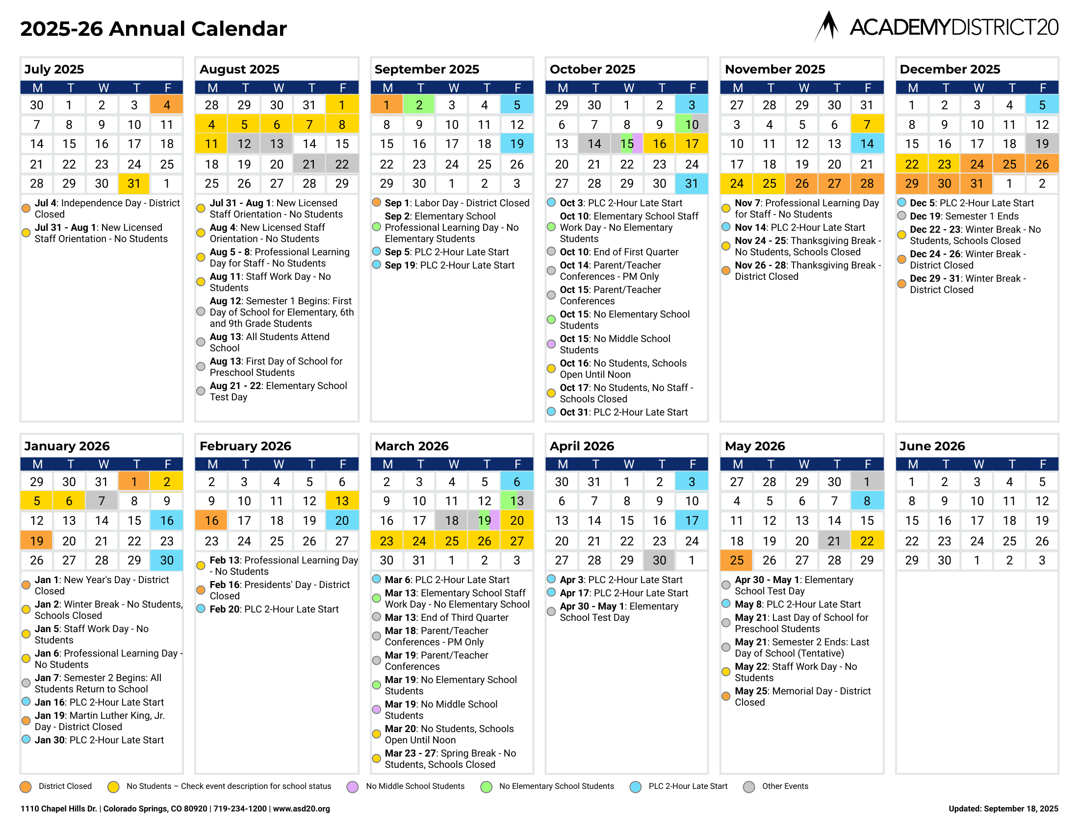 Dates are sourced from the official Academy District 20 26-27 Calendar Updates website. Dates may change at the discretion of the district. Always verify with the official school website for the latest updates.