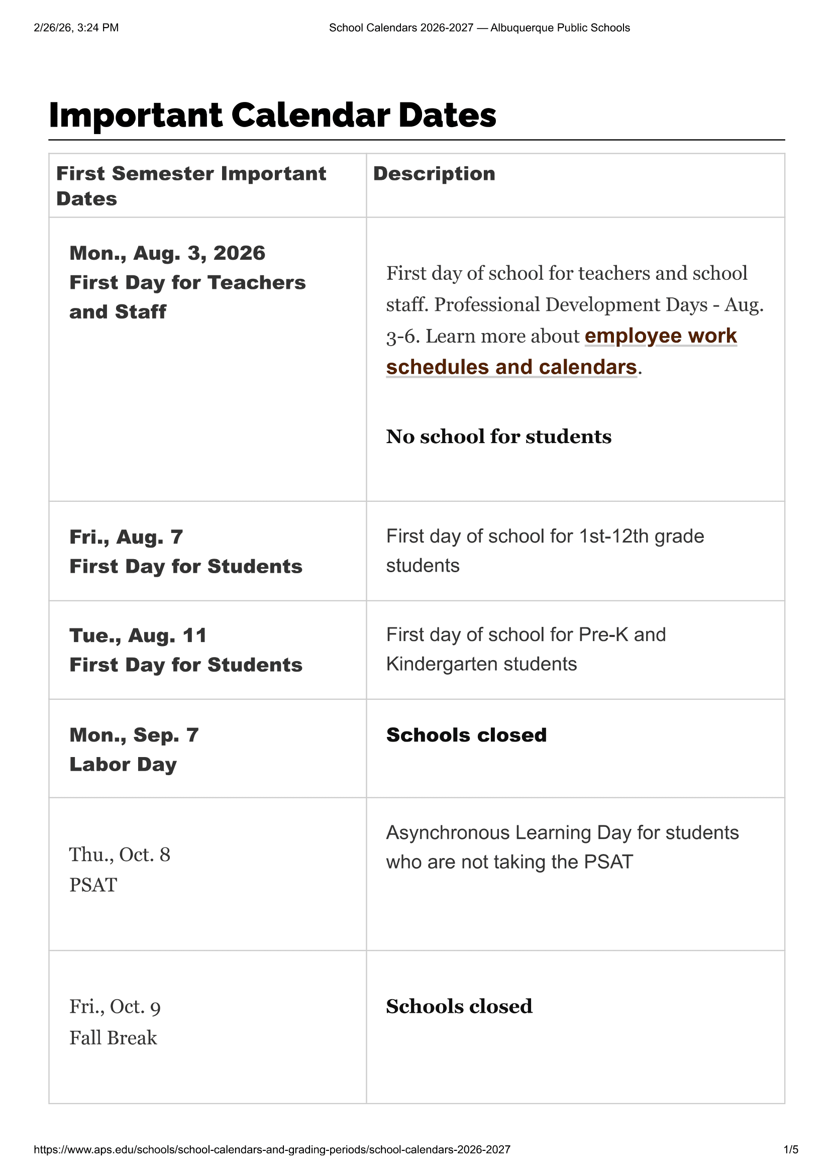 Dates are sourced from the official Albuquerque Public Schools Calendar 26-27 [PDF] website. Dates may change at the discretion of the district. Always verify with the official school website for the latest updates.
