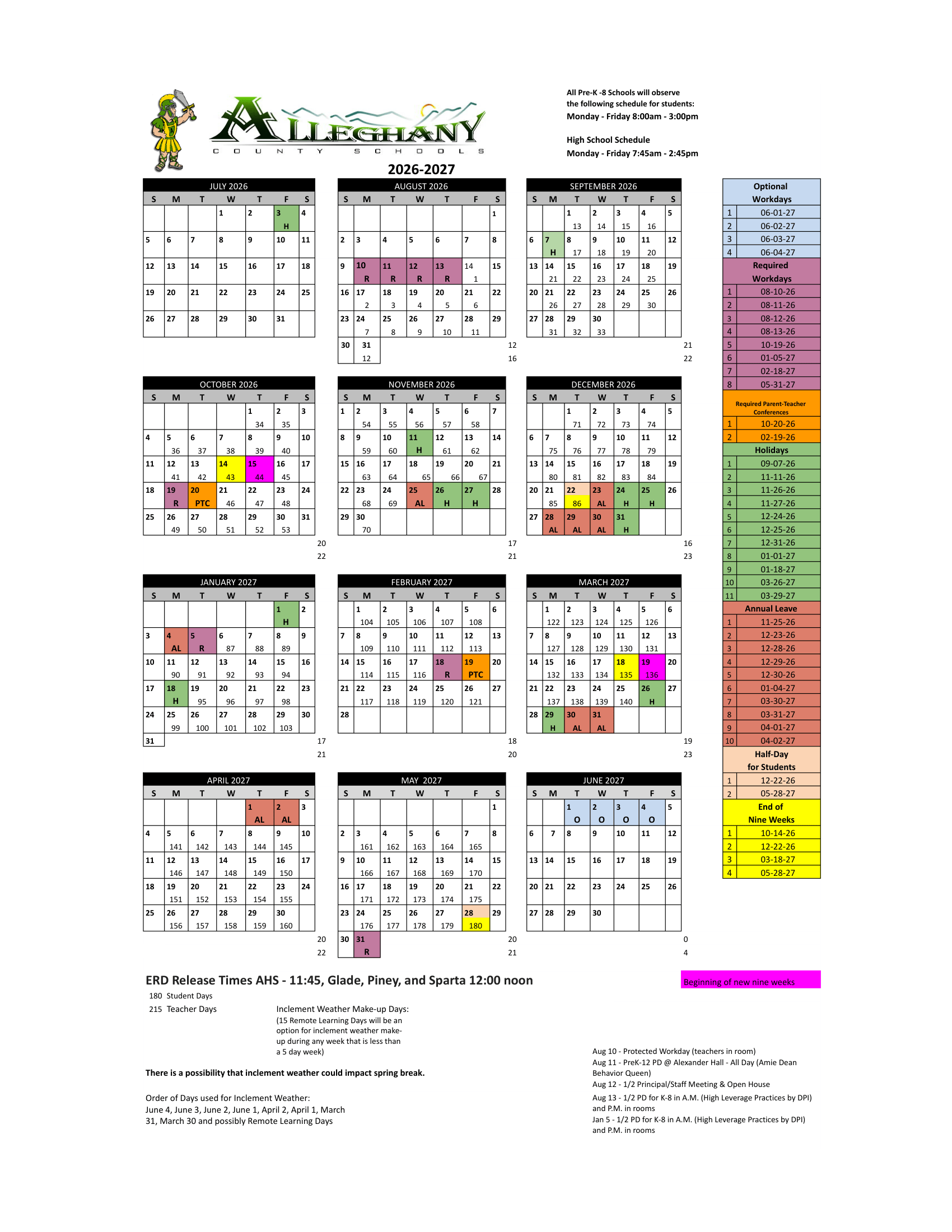 The Alleghany County Schools calendar for 2026-2027 includes a total of 180 student days.