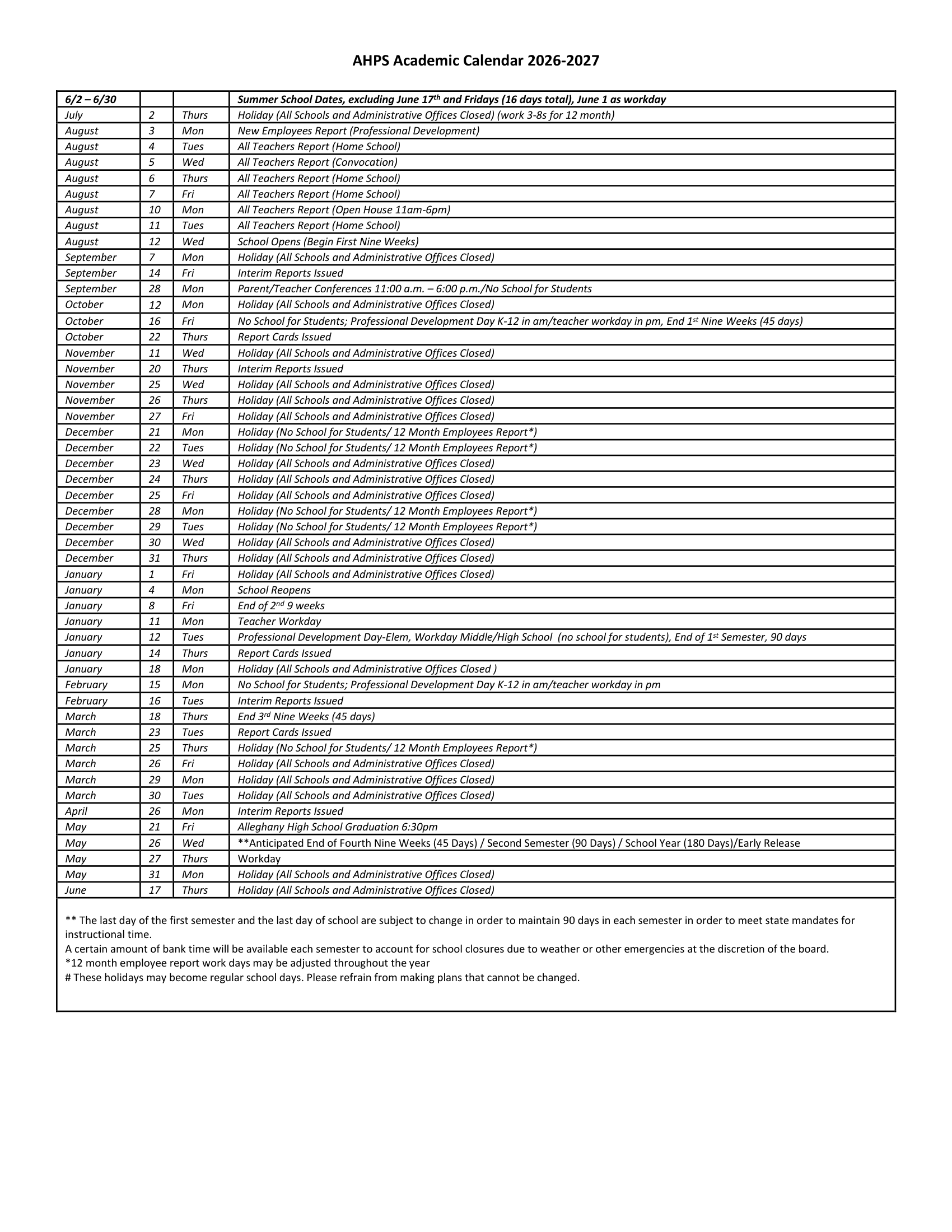 The Printable school calendar provided on this page is taken from the official Alleghany Highlands Public Schools VA Calendar 26-27 PDF. Please note that all dates and events are subject to change at the discretion of the school district. For the most accurate and updated information, please refer to the official district website or contact the school helpline.
