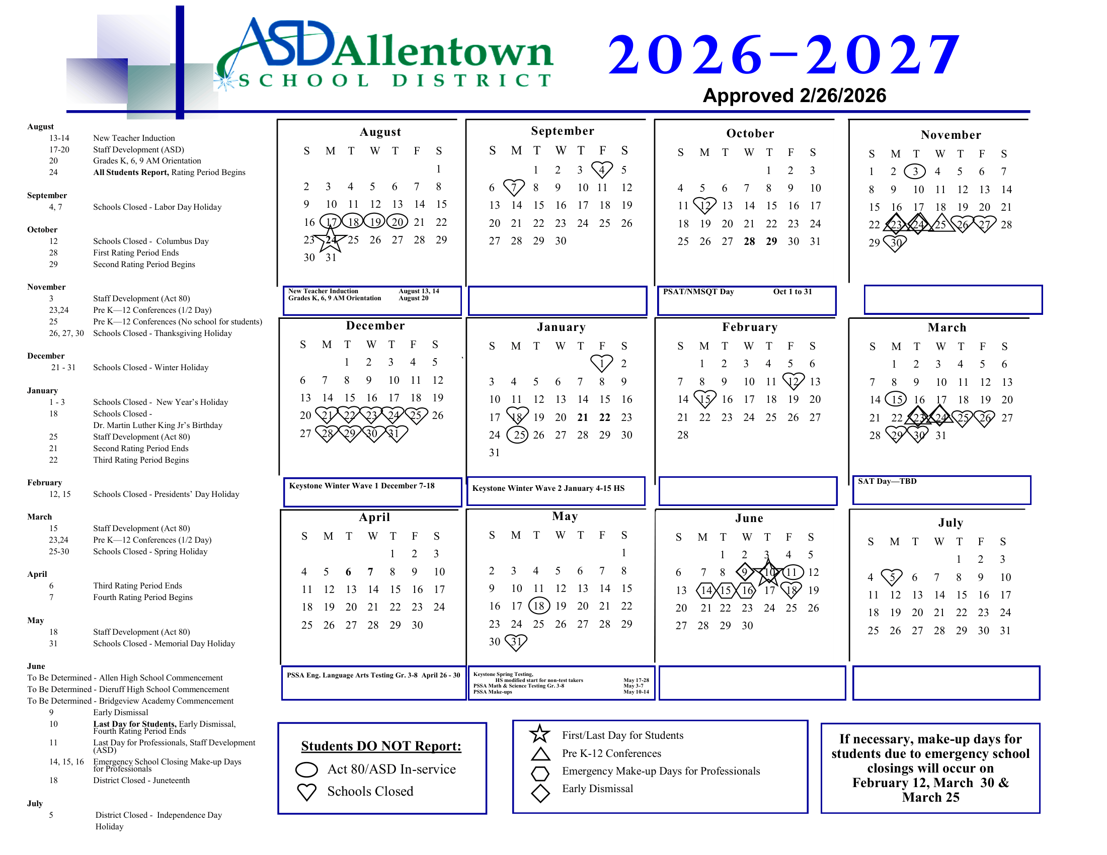 Dates are sourced from the official Allentown School District 26-27 Calendar Updated [PDF] website. Dates may change at the discretion of the district. Always verify with the official school website for the latest updates.