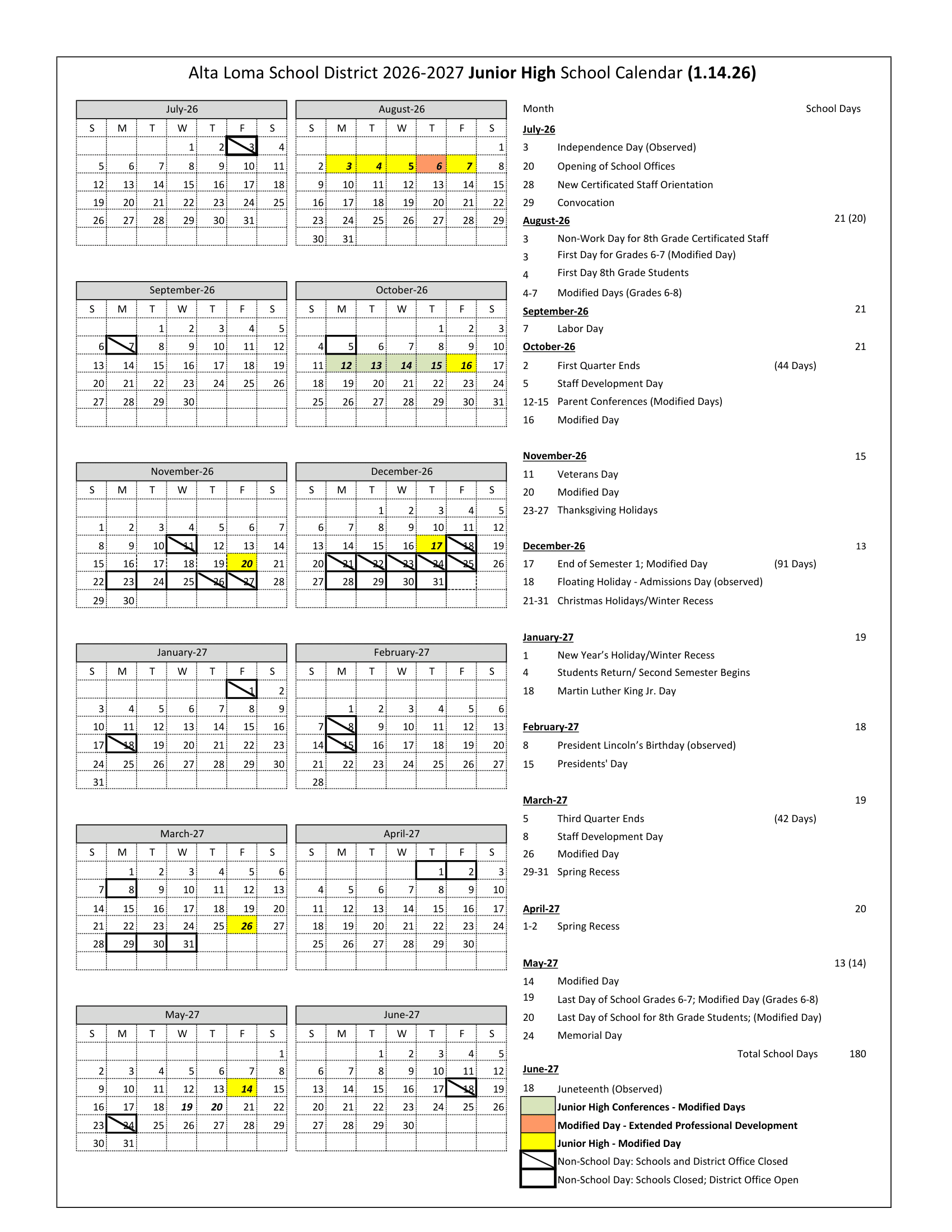 Dates are sourced from the official Alta Loma School District Junior High School 26-27 Calendar [pdf] website. Dates may change at the discretion of the district. Always verify with the official school website for the latest updates.