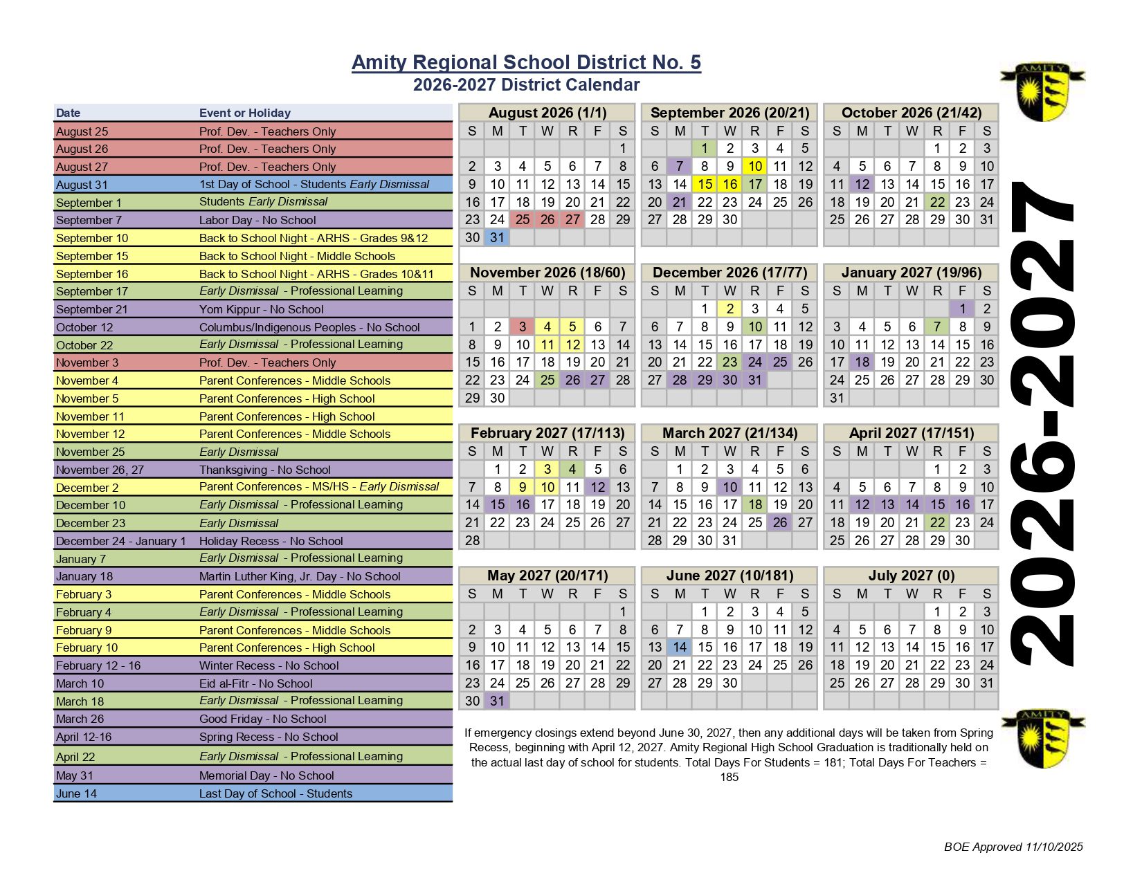 Amity Regional School District No. 5 Calendar (2026-2027)
