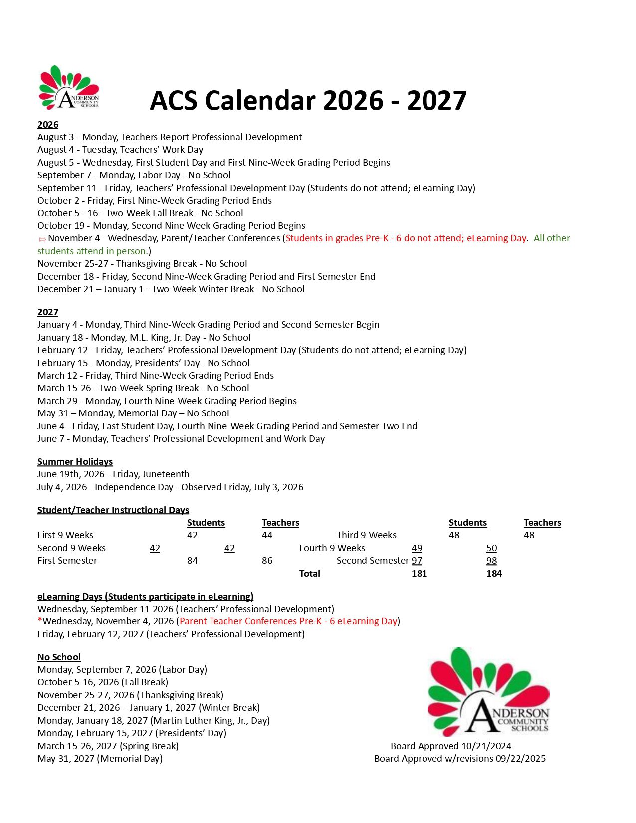 Dates are sourced from the official Anderson Community Schools IN Calendar 26-27 [PDF] website. Dates may change at the discretion of the district. Always verify with the official school website for the latest updates.