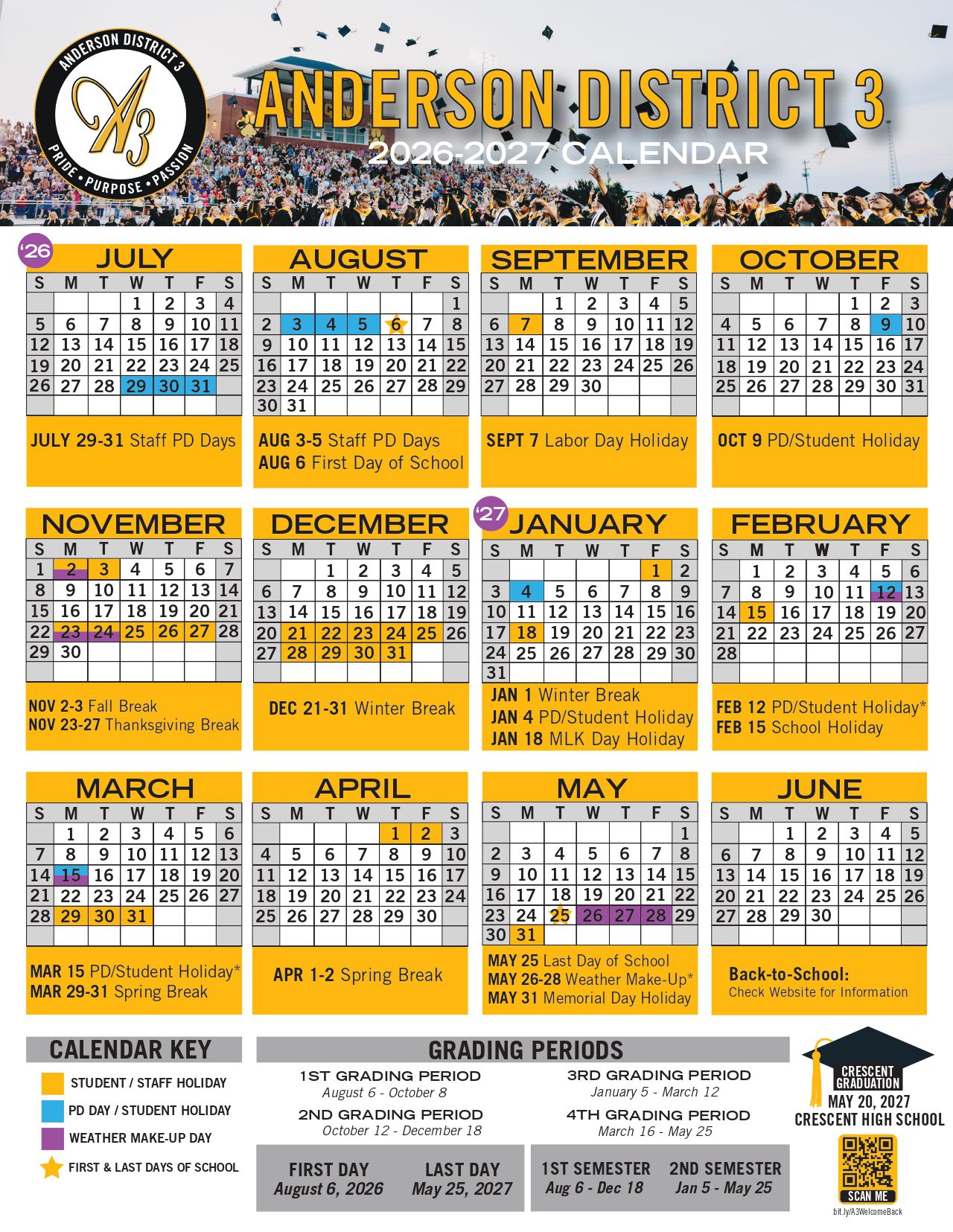 Dates are sourced from the official Anderson District 3 SC Calendar 26-27 Revised [PDF] website. Dates may change at the discretion of the district. Always verify with the official school website for the latest updates.