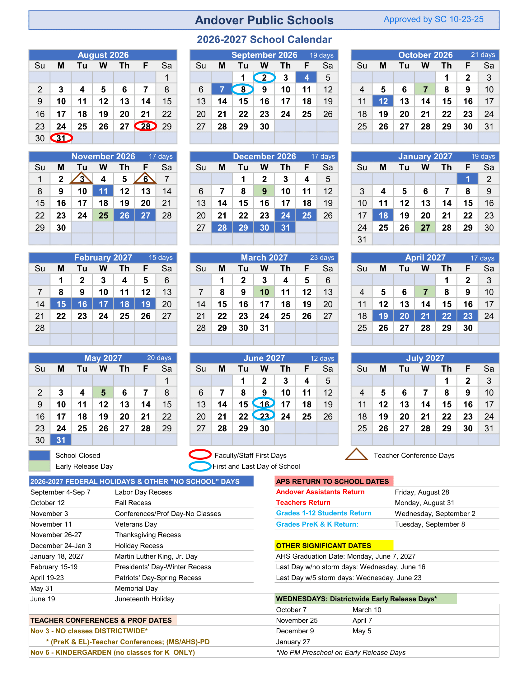 Dates are sourced from the official Andover Public Schools MA Calendar 26-27 Revised [PDF] website. Dates may change at the discretion of the district. Always verify with the official school website for the latest updates.