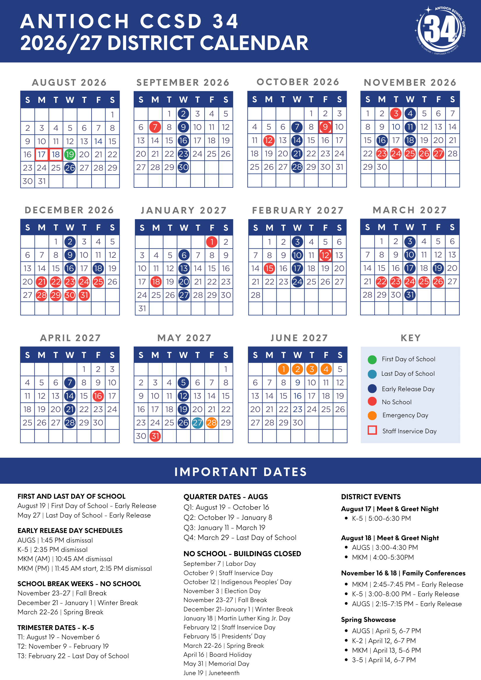 The Printable school calendar provided on this page is taken from the official Antioch CCSD 34 Calendar 2026 to 2027 . Please note that all dates and events are subject to change at the discretion of the school district. For the most accurate and updated information, please refer to the official district website or contact the school helpline.