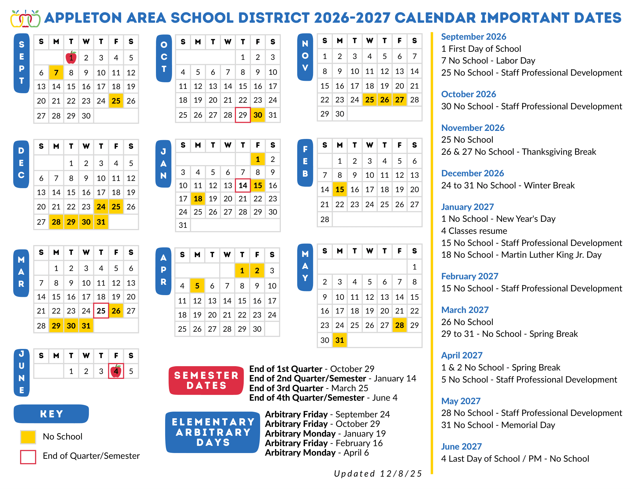 Dates are sourced from the official Appleton Area School WI District 26-27 Calendar Updates website. Dates may change at the discretion of the district. Always verify with the official school website for the latest updates.