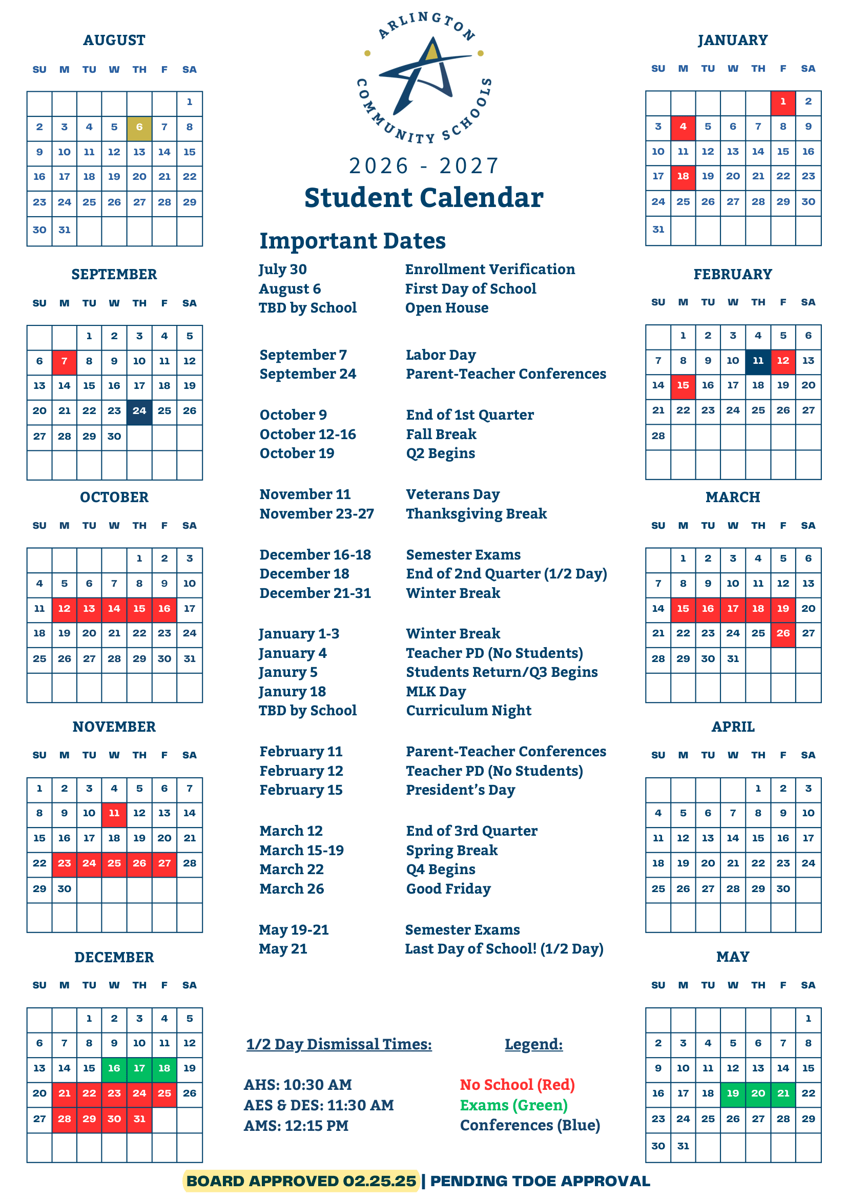 Dates are sourced from the official Arlington Community Schools Calendar 26-27 Revised website. Dates may change at the discretion of the district. Always verify with the official school website for the latest updates.