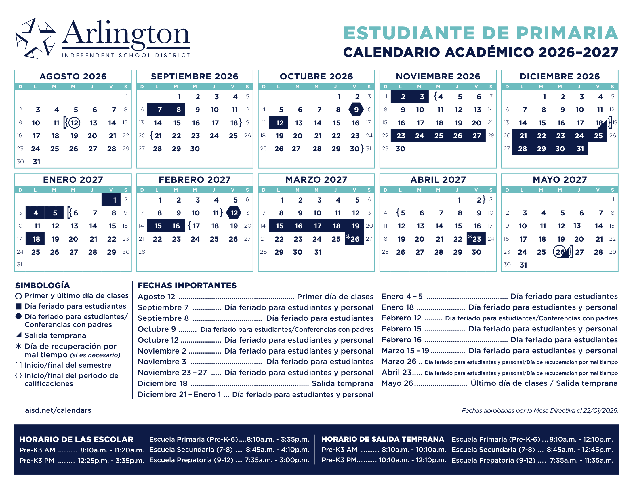 Dates are sourced from the official Arlington ISD Independent School District 26-27 Calendar [Revised] website. Dates may change at the discretion of the district. Always verify with the official school website for the latest updates.