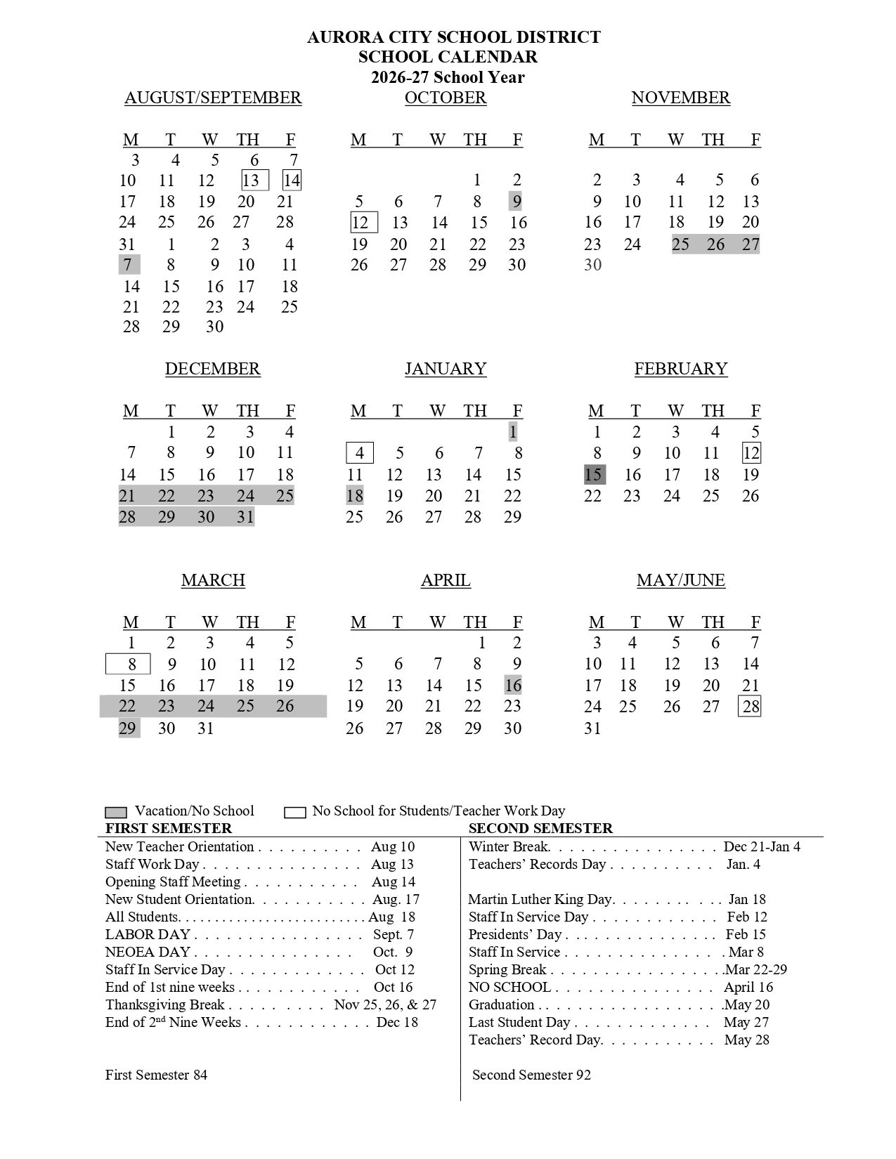 AURORA CITY SCHOOL DISTRICT Calendar (2026-2027)