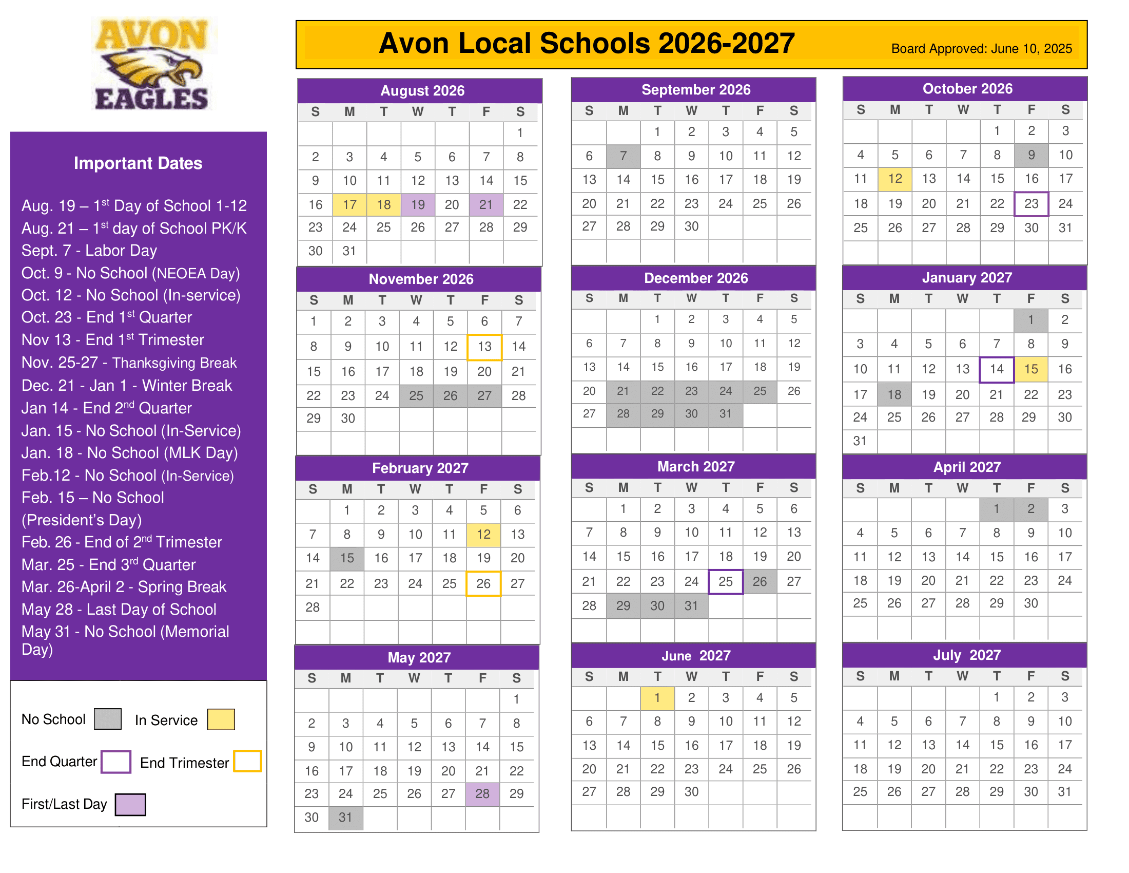 Avon Local Schools Calendar 26-27 Updates