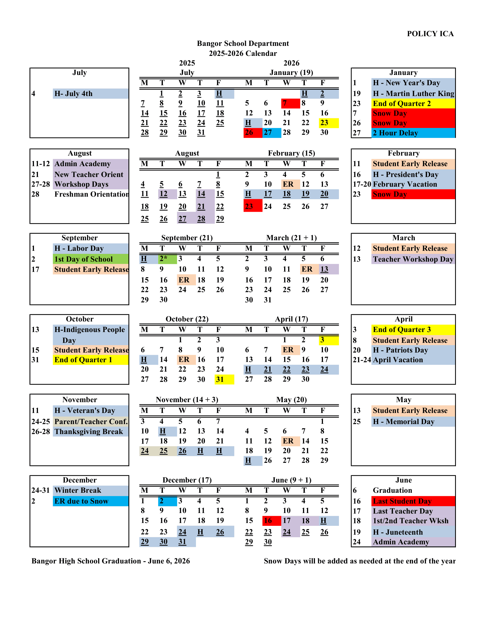 Bangor School Department Calendar (2025-2026)