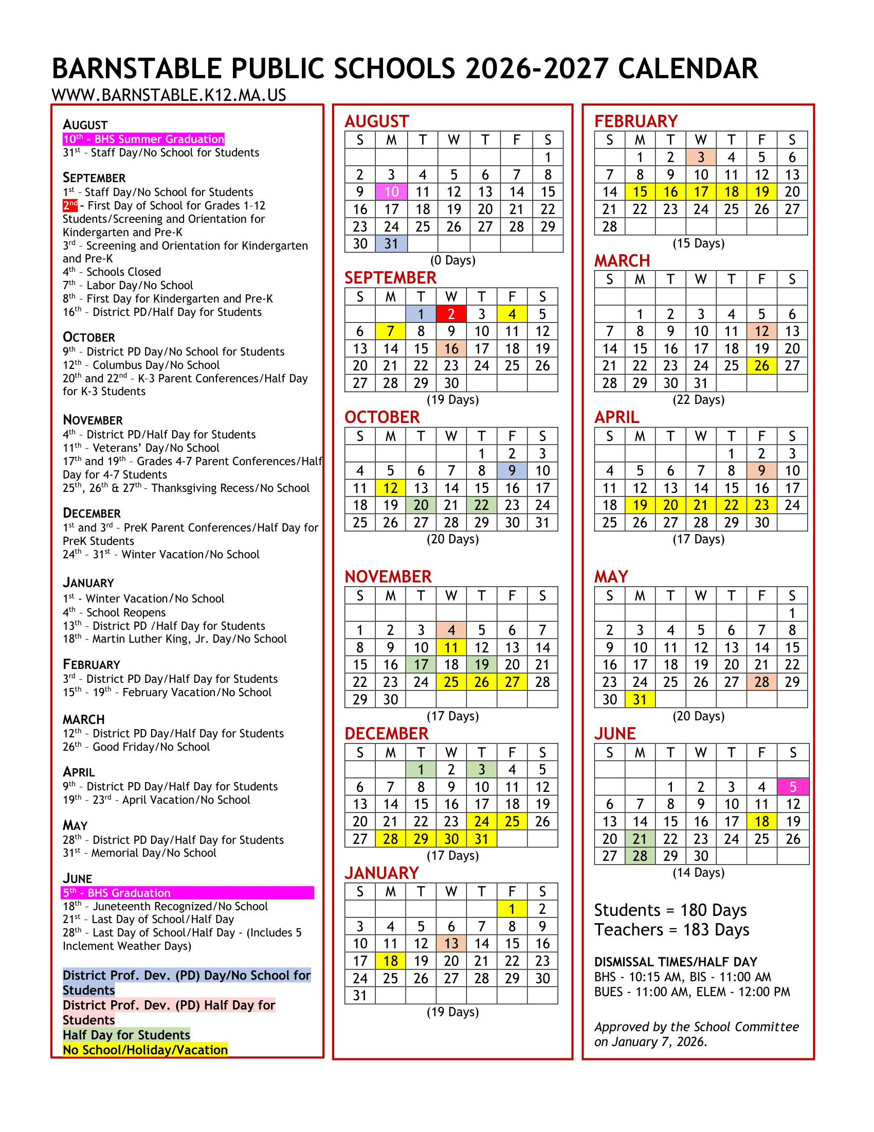 Dates are sourced from the official Barnstable Public Schools Calendar 26-27 Revised [PDF] website. Dates may change at the discretion of the district. Always verify with the official school website for the latest updates.