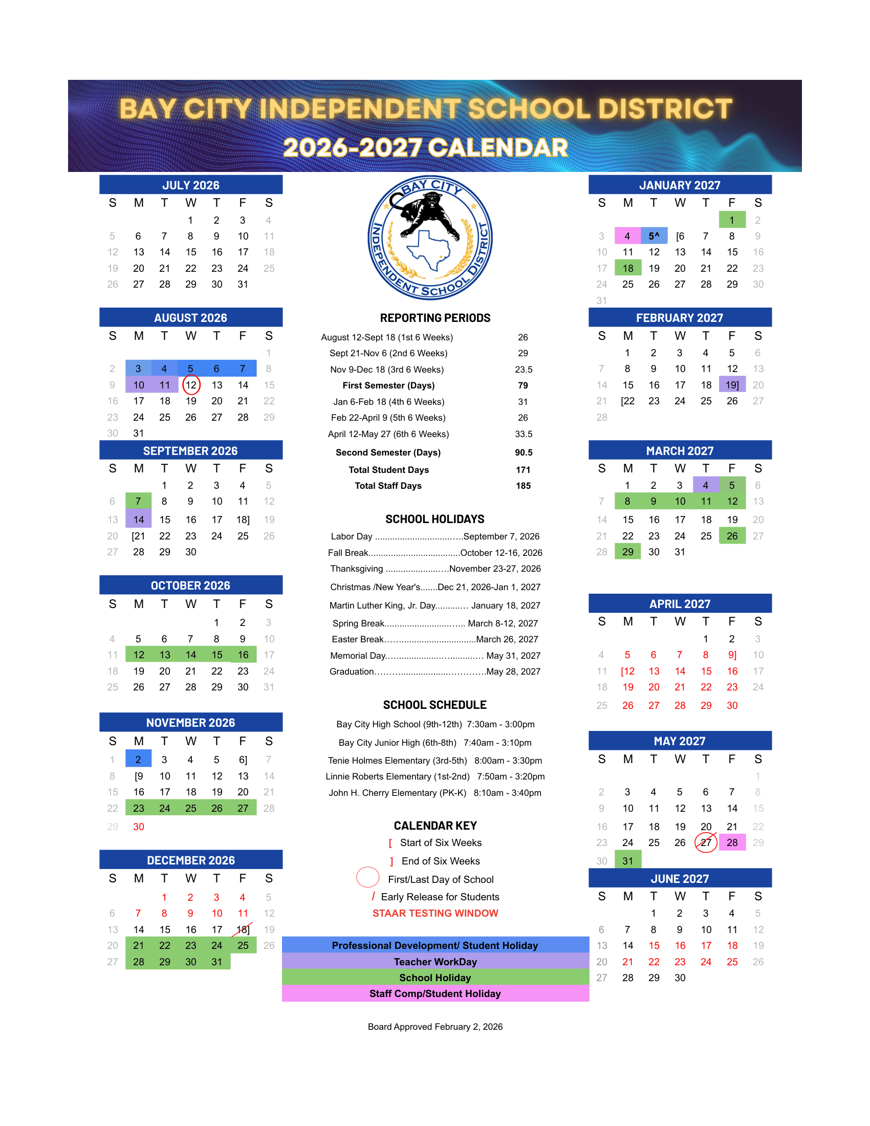 Dates are sourced from the official Bay City Isd School Calendar 26-27 Revised [PDF] website. Dates may change at the discretion of the district. Always verify with the official school website for the latest updates.