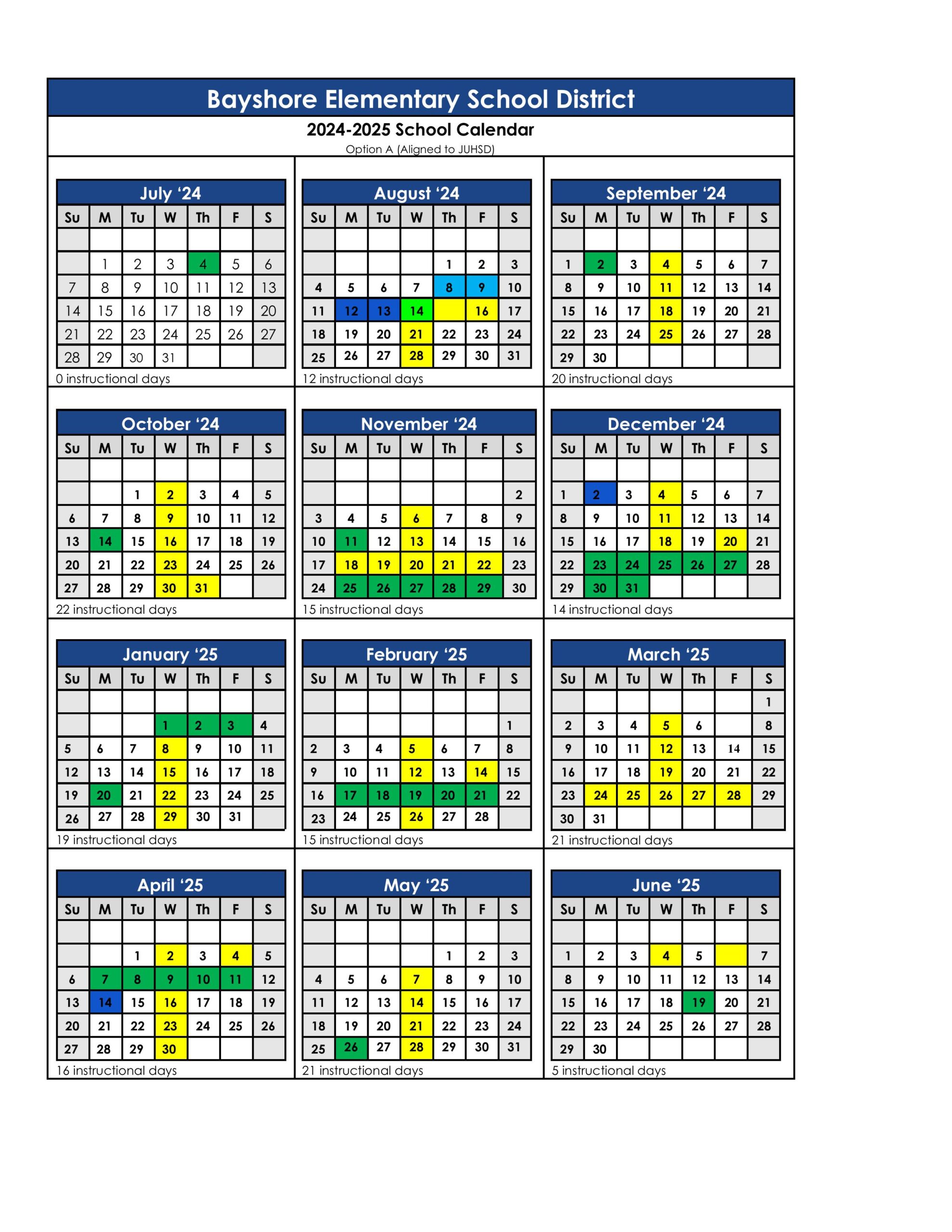 The school calendar provided on this page is taken from the official Bayshore Elementary School District website. Please note that all dates and events are subject to change at the discretion of the school district. For the most accurate and updated information, please refer to the official district website or contact the school helpline.