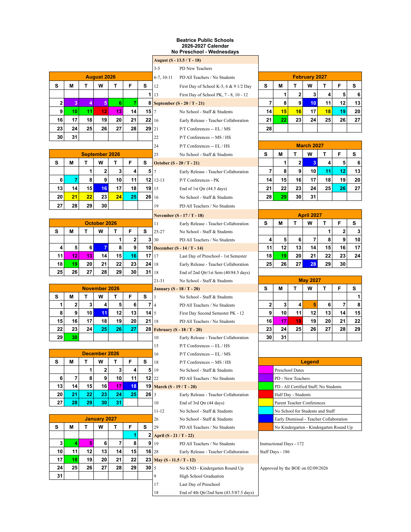 Dates are sourced from the official Beatrice Public Schools 26-27 Calendar [PDF] website. Dates may change at the discretion of the district. Always verify with the official school website for the latest updates.
