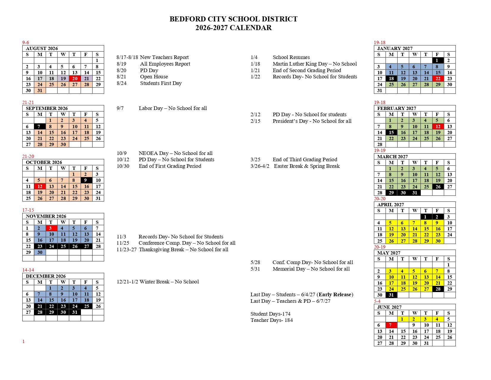 The Printable school calendar provided on this page is taken from the official Bedford City School District Calendar 26/27 . Please note that all dates and events are subject to change at the discretion of the school district. For the most accurate and updated information, please refer to the official district website or contact the school helpline.