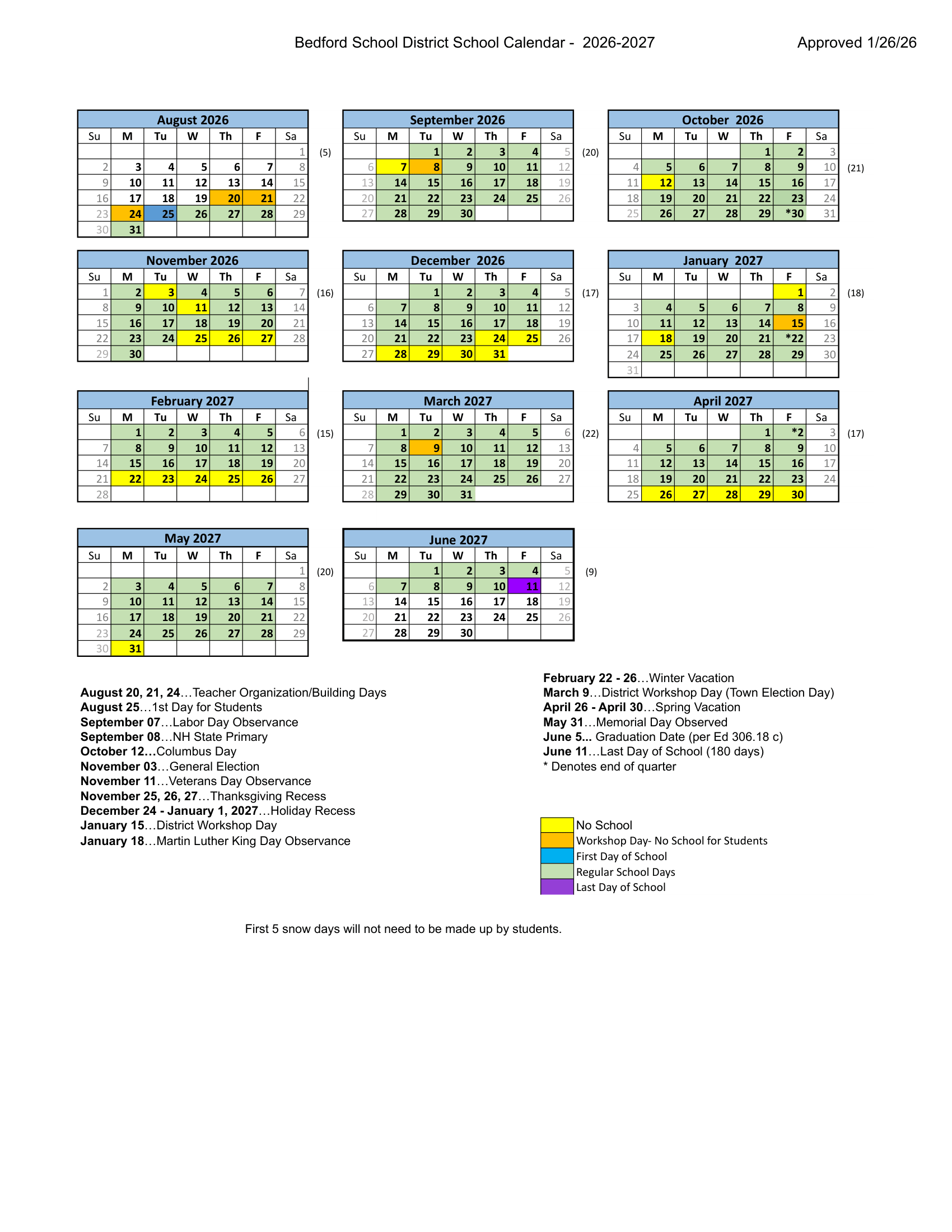 Dates are sourced from the official Bedford School District Calendar 26-27 Revised[PDF] website. Dates may change at the discretion of the district. Always verify with the official school website for the latest updates.