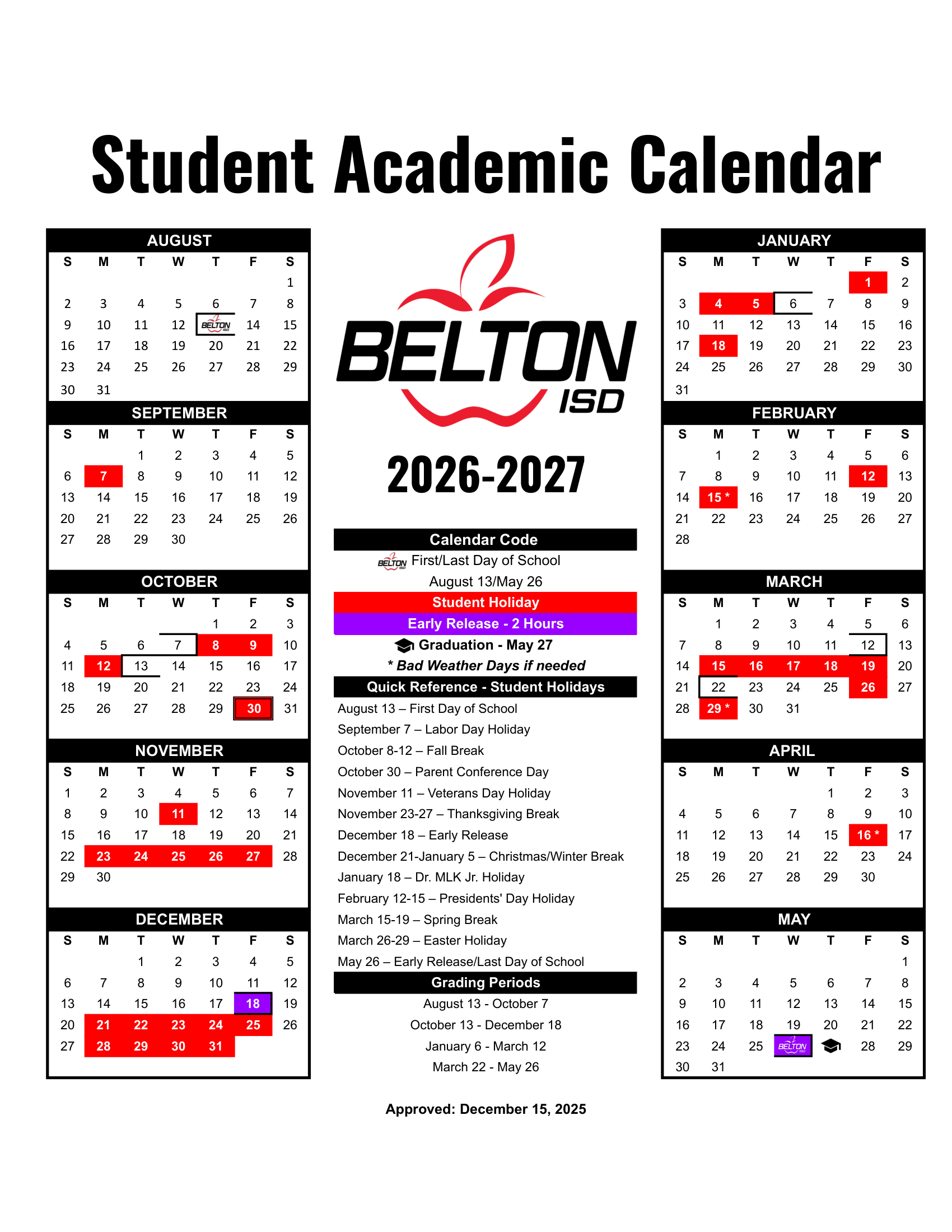 Dates are sourced from the official Belton ISD Calendar 26-27 Revised [PDF] website. Dates may change at the discretion of the district. Always verify with the official school website for the latest updates.