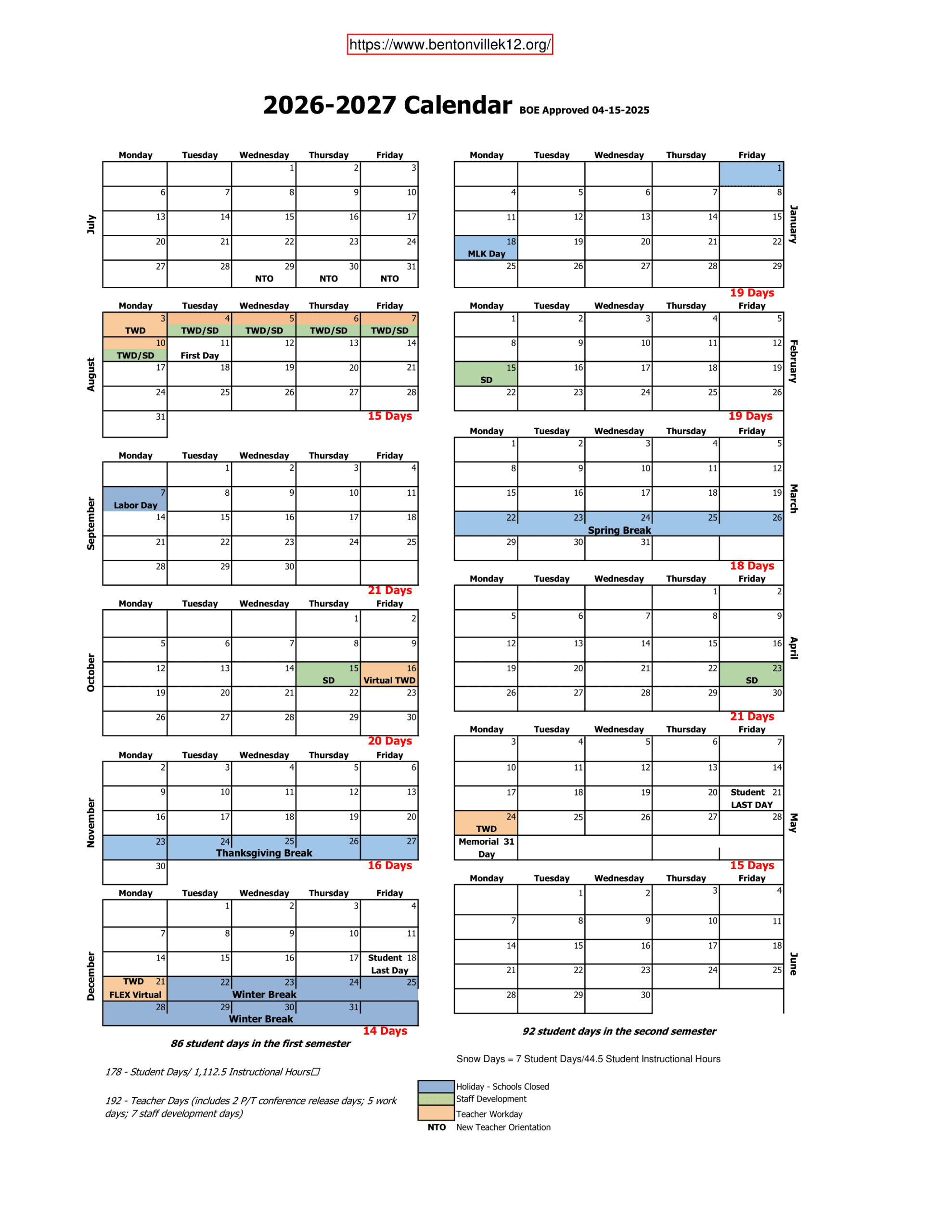 Dates are sourced from the official Bentonville Schools AR 26-27 Calendar Updates [PDF] website. Dates may change at the discretion of the district. Always verify with the official school website for the latest updates.
