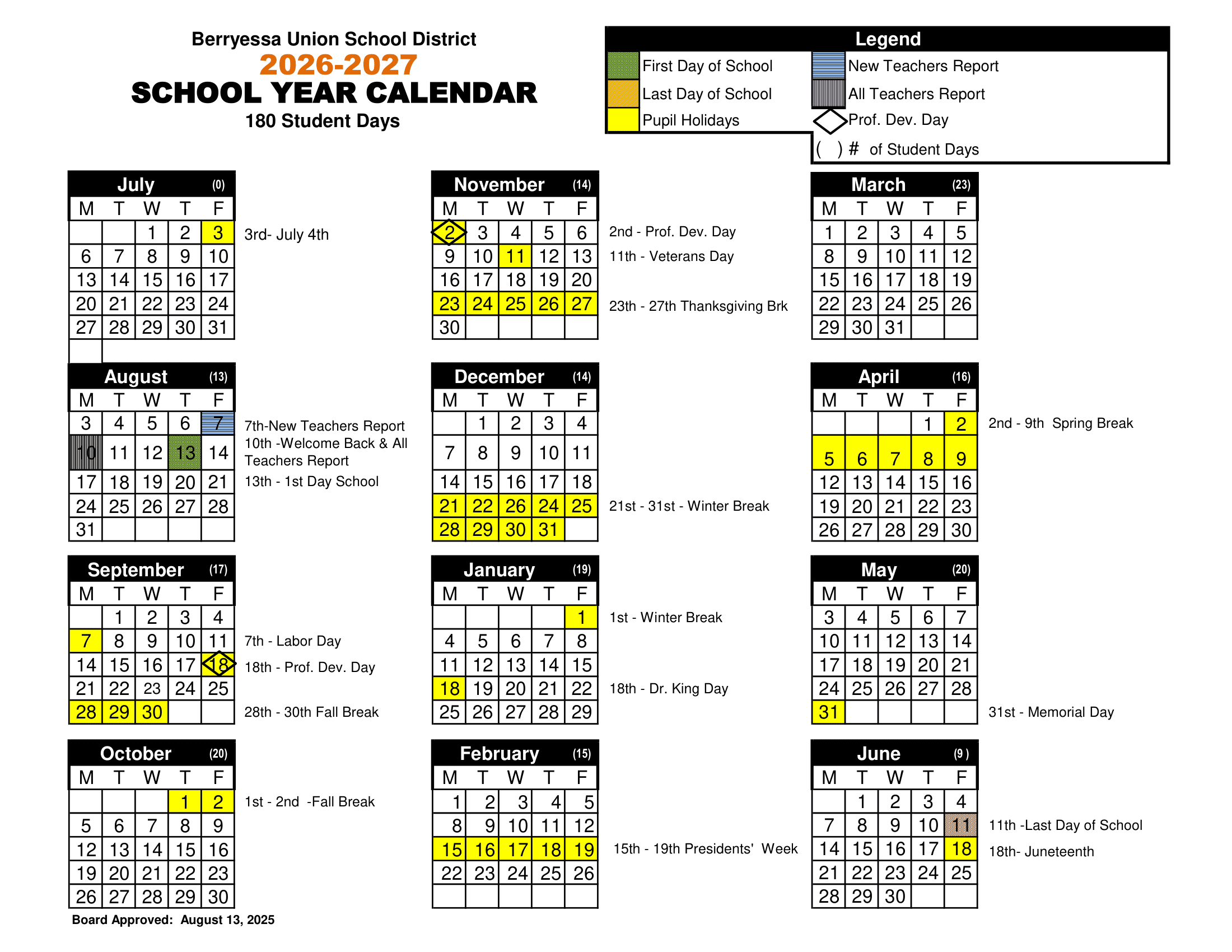 Dates are sourced from the official Berryessa Union School District 26-27 Calendar [PDF] website. Dates may change at the discretion of the district. Always verify with the official school website for the latest updates.