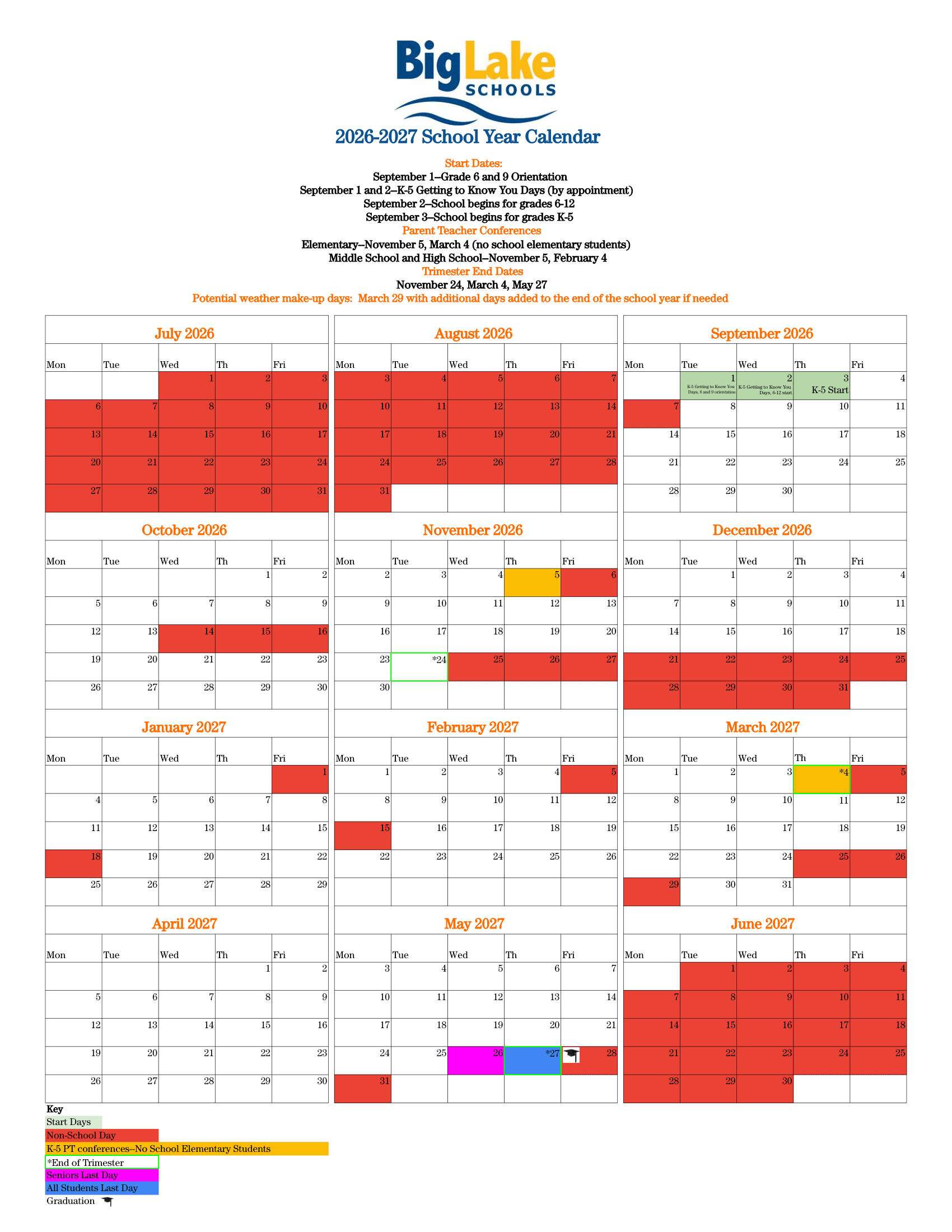 Dates are sourced from the official Big Lake Schools MN 26-27 Calendar [PDF] website. Dates may change at the discretion of the district. Always verify with the official school website for the latest updates.