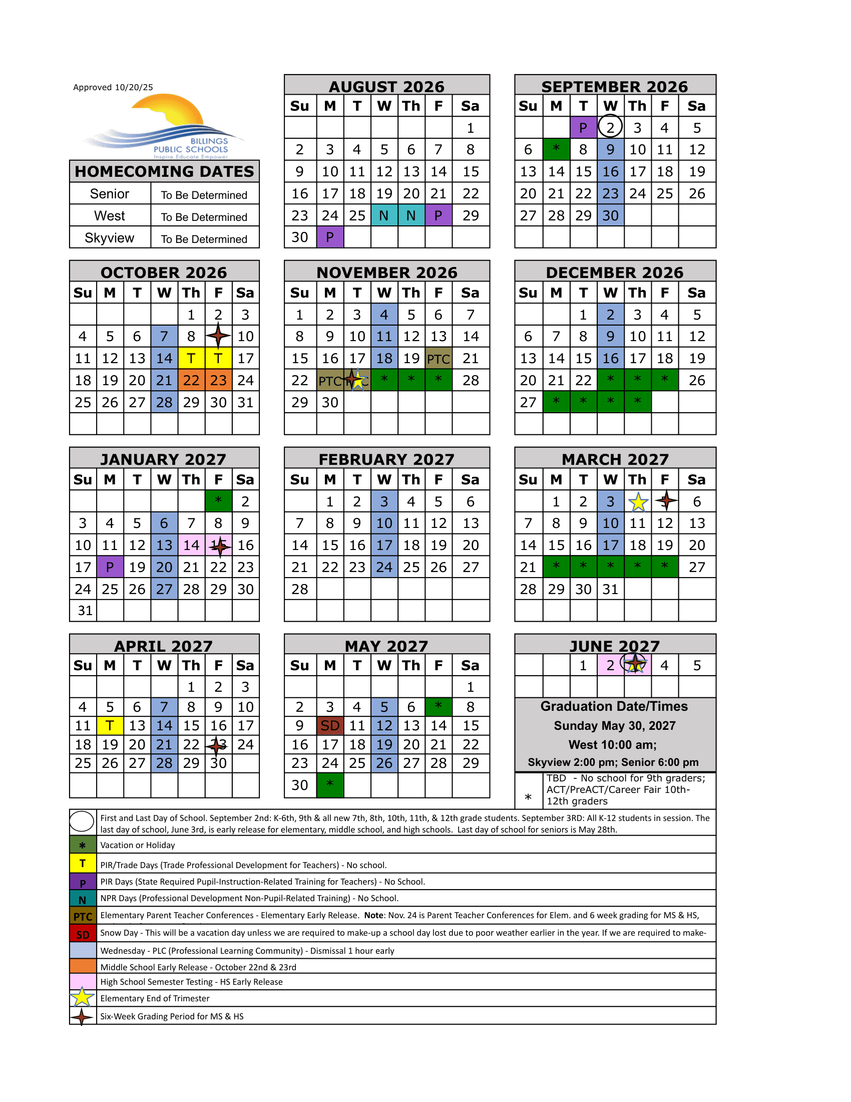 Dates are sourced from the official Billings Public Schools Calendar 26-27 Revised [PDF] website. Dates may change at the discretion of the district. Always verify with the official school website for the latest updates.