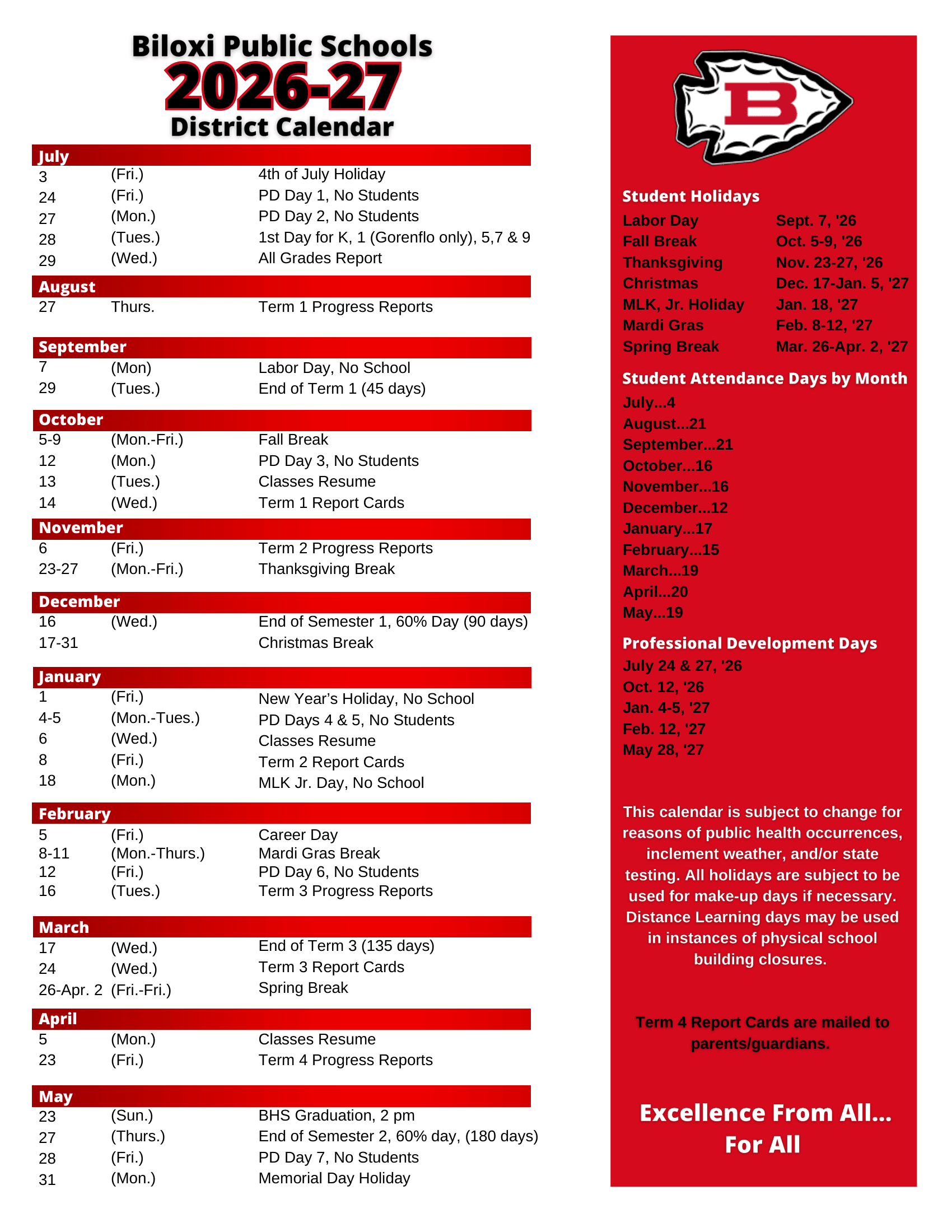 Dates are sourced from the official Biloxi Public Schools Calendar 26-27 UPDATED [PDF] website. Dates may change at the discretion of the district. Always verify with the official school website for the latest updates.