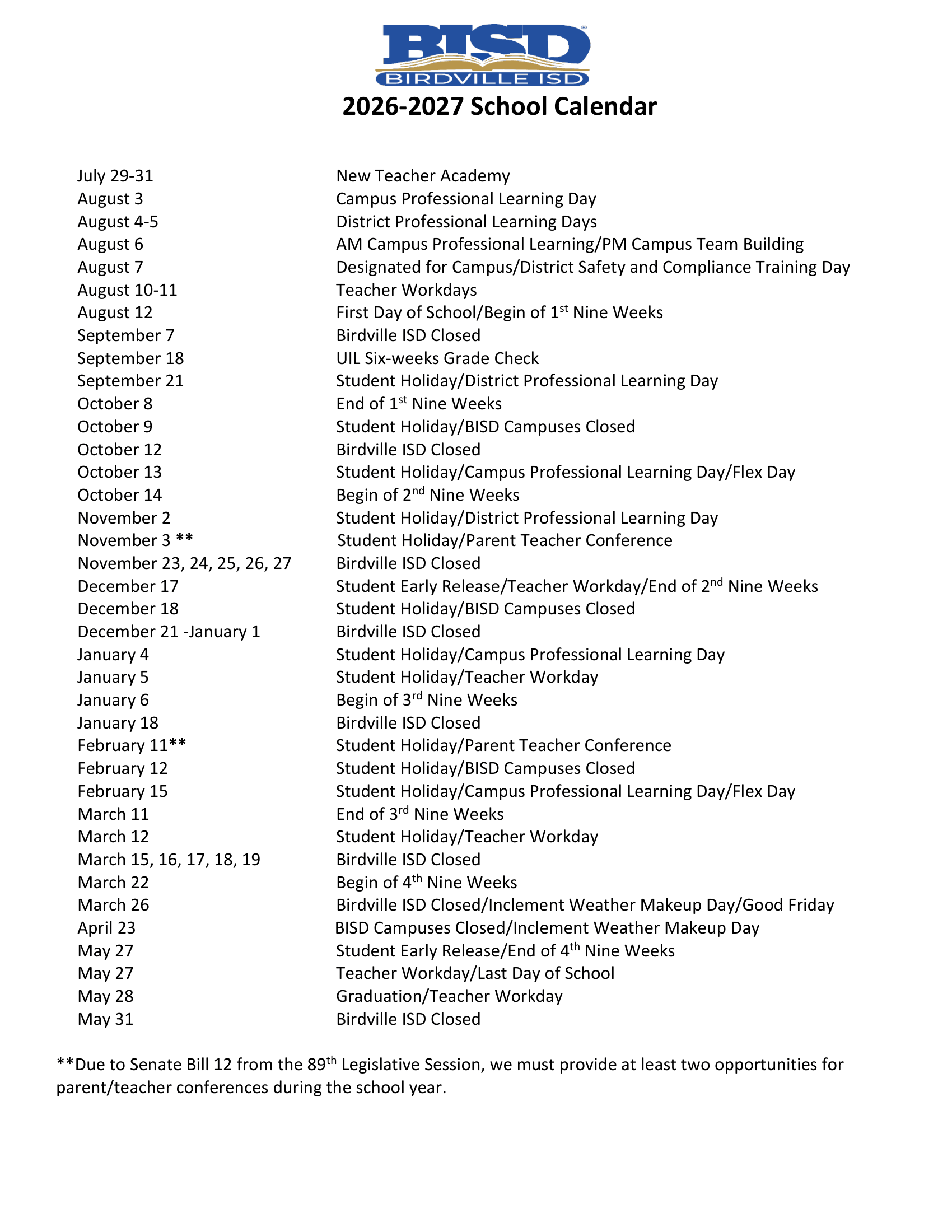 | Feb 12, 2027 | Student Holiday/BISD Campuses Closed |