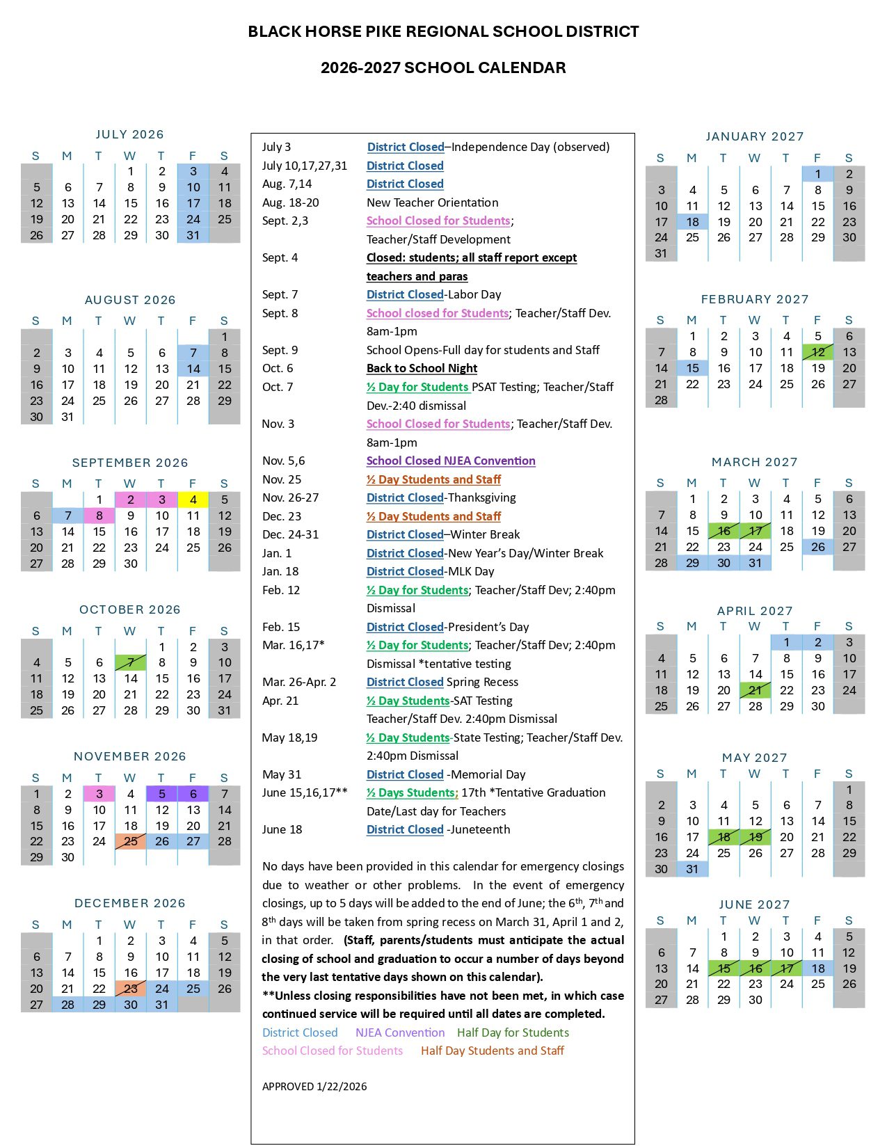 Dates are sourced from the official BLACK HORSE PIKE REGIONAL SCHOOL DISTRICT 26-27 Calendar website. Dates may change at the discretion of the district. Always verify with the official school website for the latest updates.