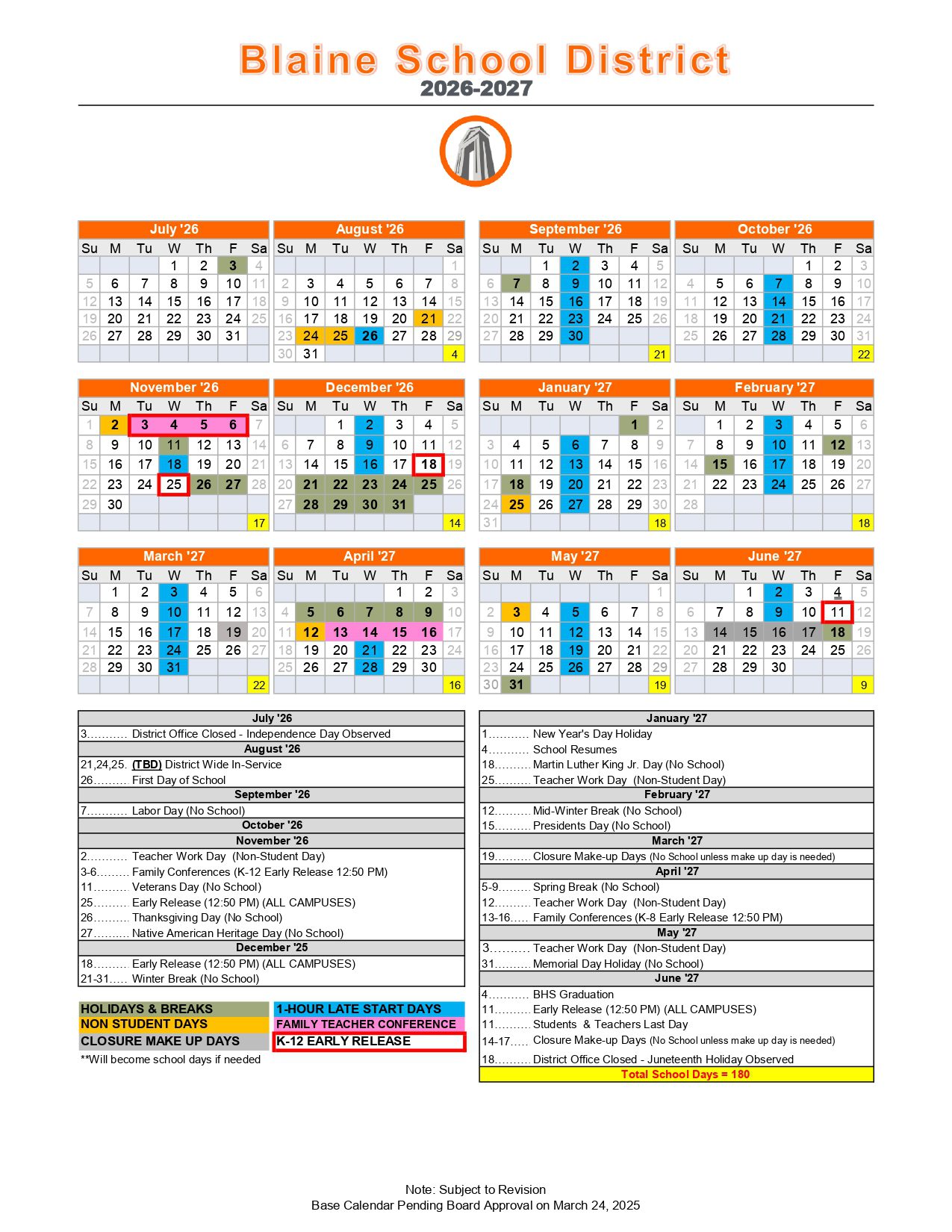 Blaine School District Calendar (2026-2027)