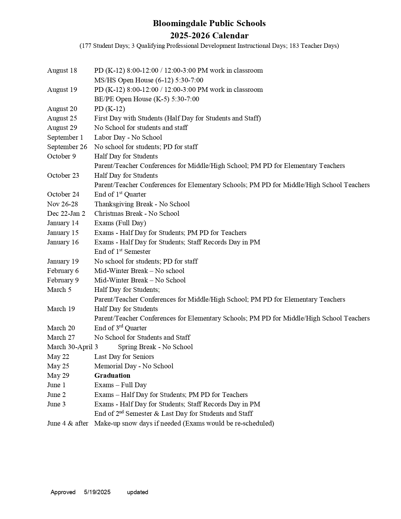 Bloomingdale Public Schools 2025-2026 School Calendar FAQ