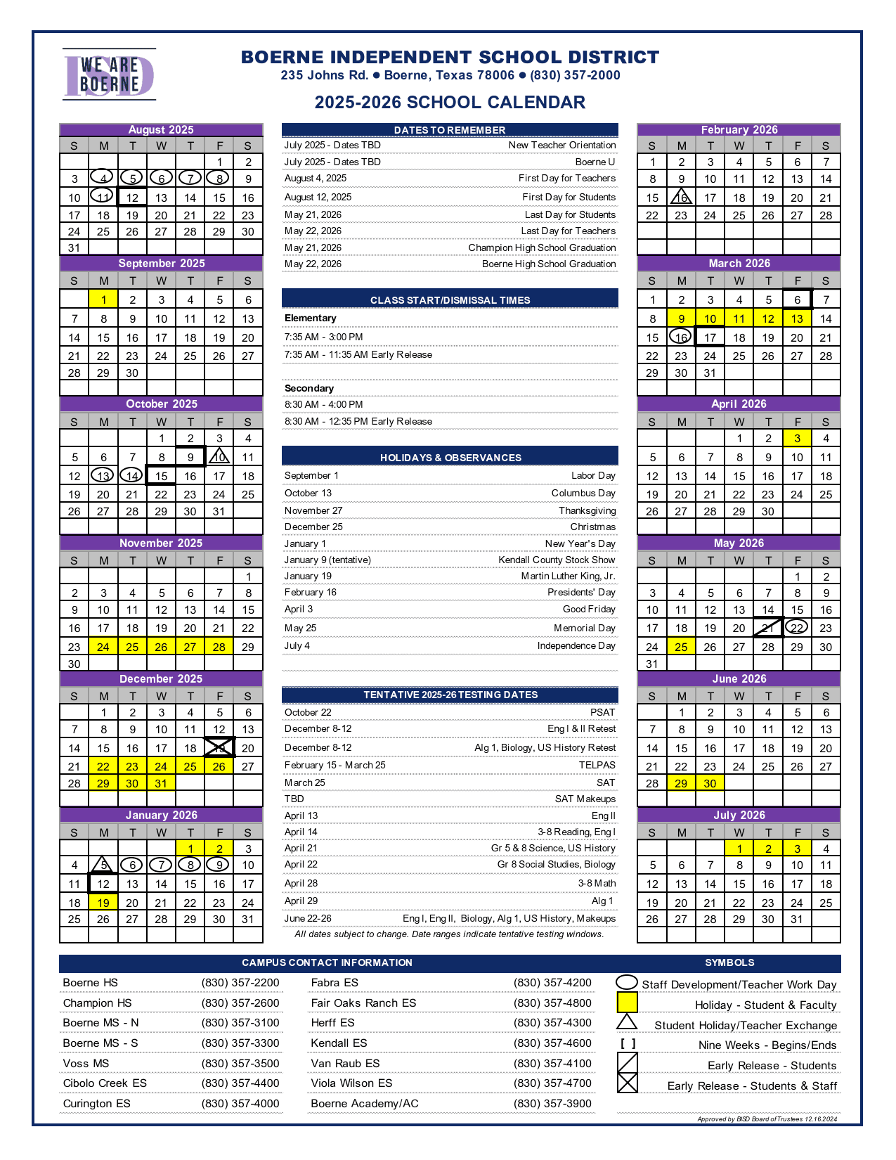 The school calendar provided on this page is taken from the official Boerne ISD School District website. Please note that all dates and events are subject to change at the discretion of the school district. For the most accurate and updated information, please refer to the official district website or contact the school helpline.