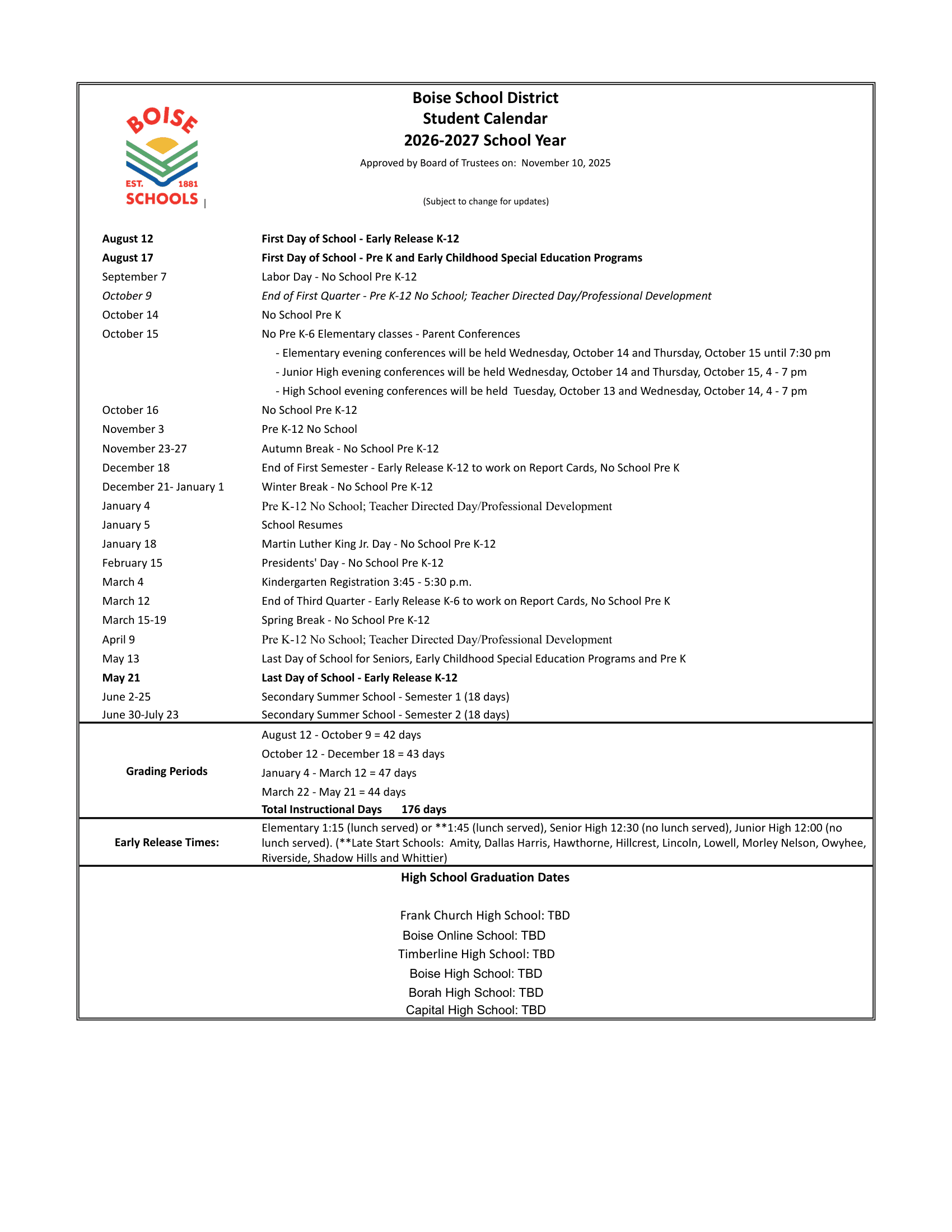 Dates are sourced from the official Boise School District Calendar 26-27 Calendar [PDF] website. Dates may change at the discretion of the district. Always verify with the official school website for the latest updates.
