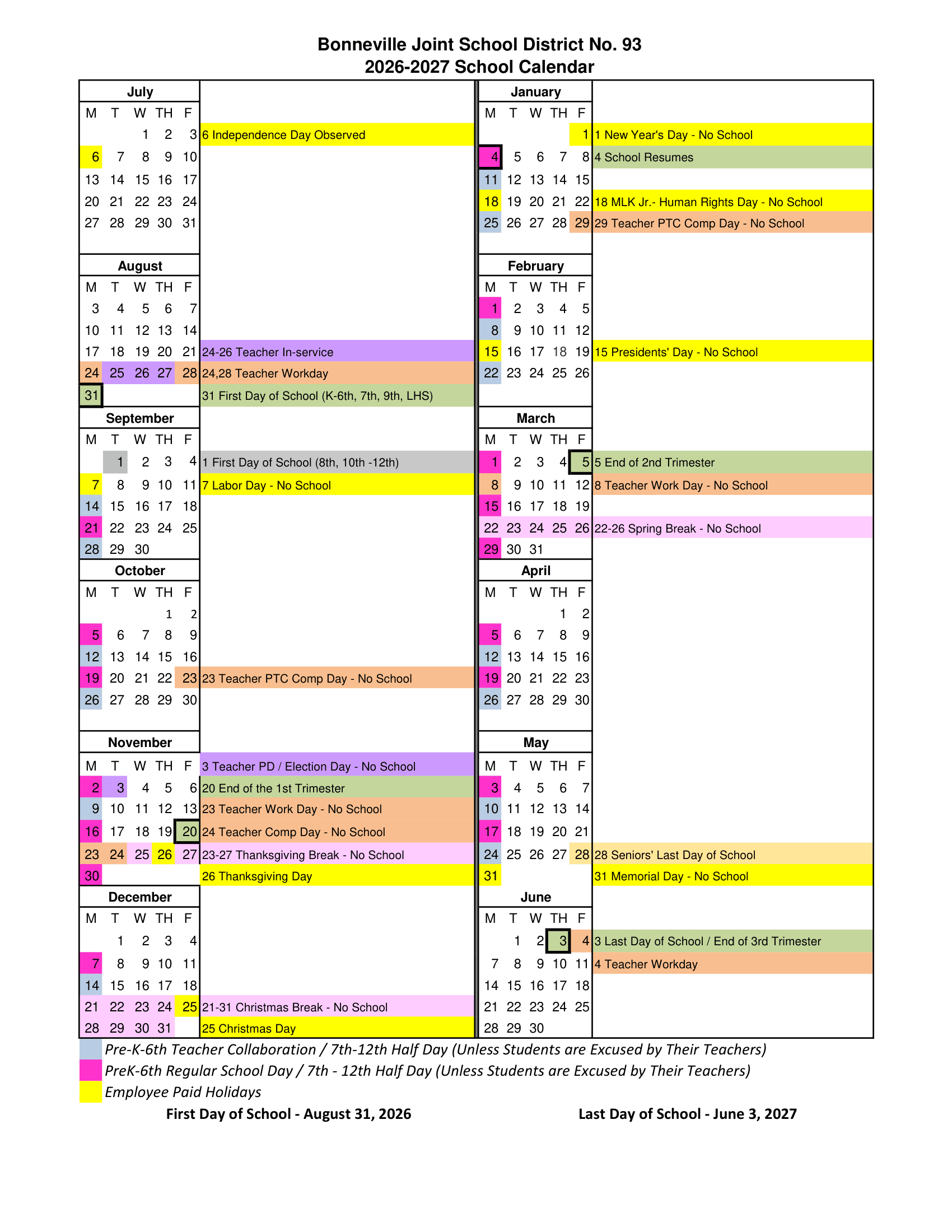 Bonneville Joint School District No. 93 Calendar 2026-2027 Important Dates
