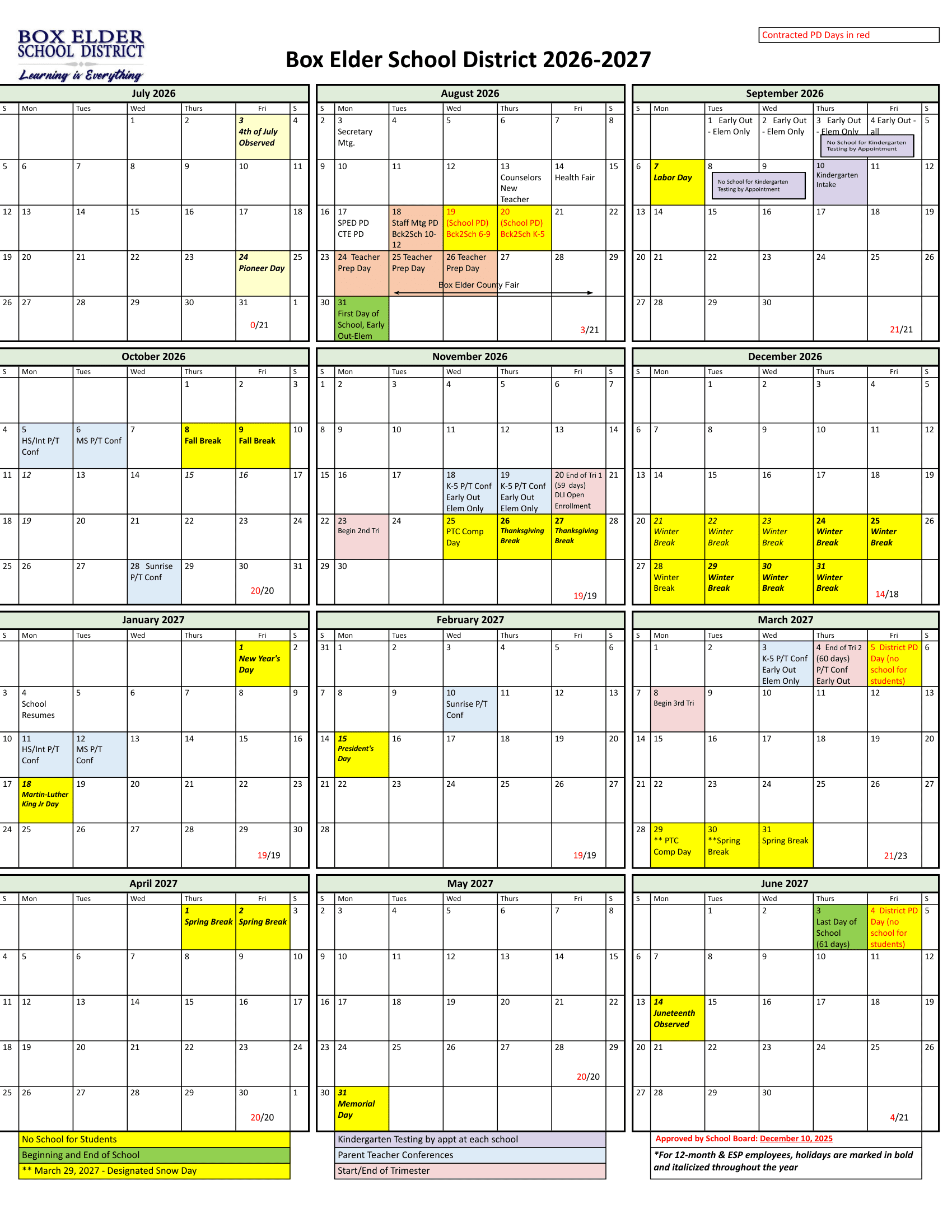 Box Elder School District Calendar (2026-2027)