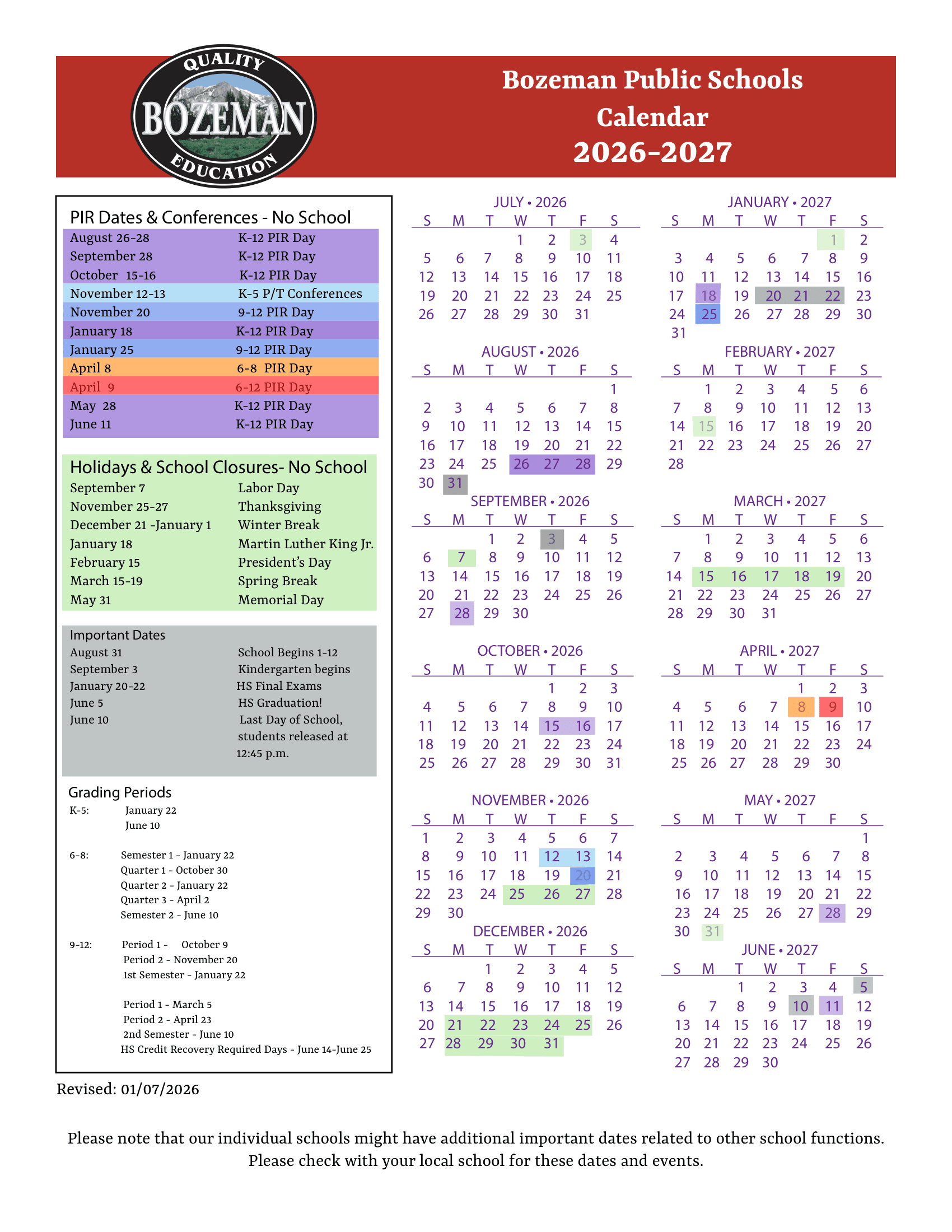 Dates are sourced from the official Bozeman Public Schools Calendar 26-27 Revised [PDF] website. Dates may change at the discretion of the district. Always verify with the official school website for the latest updates.