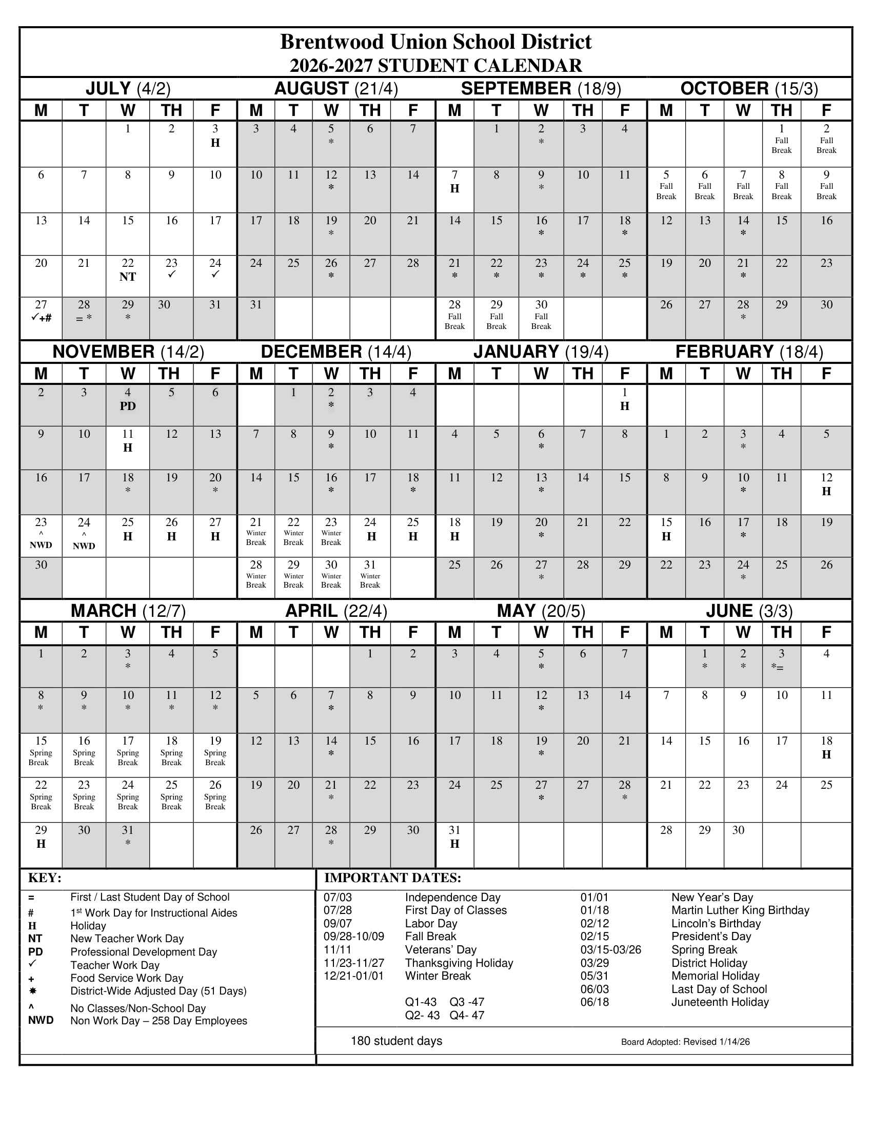 Dates are sourced from the official Brentwood Union School District USD 26-27 Calendar[PDF] website. Dates may change at the discretion of the district. Always verify with the official school website for the latest updates.