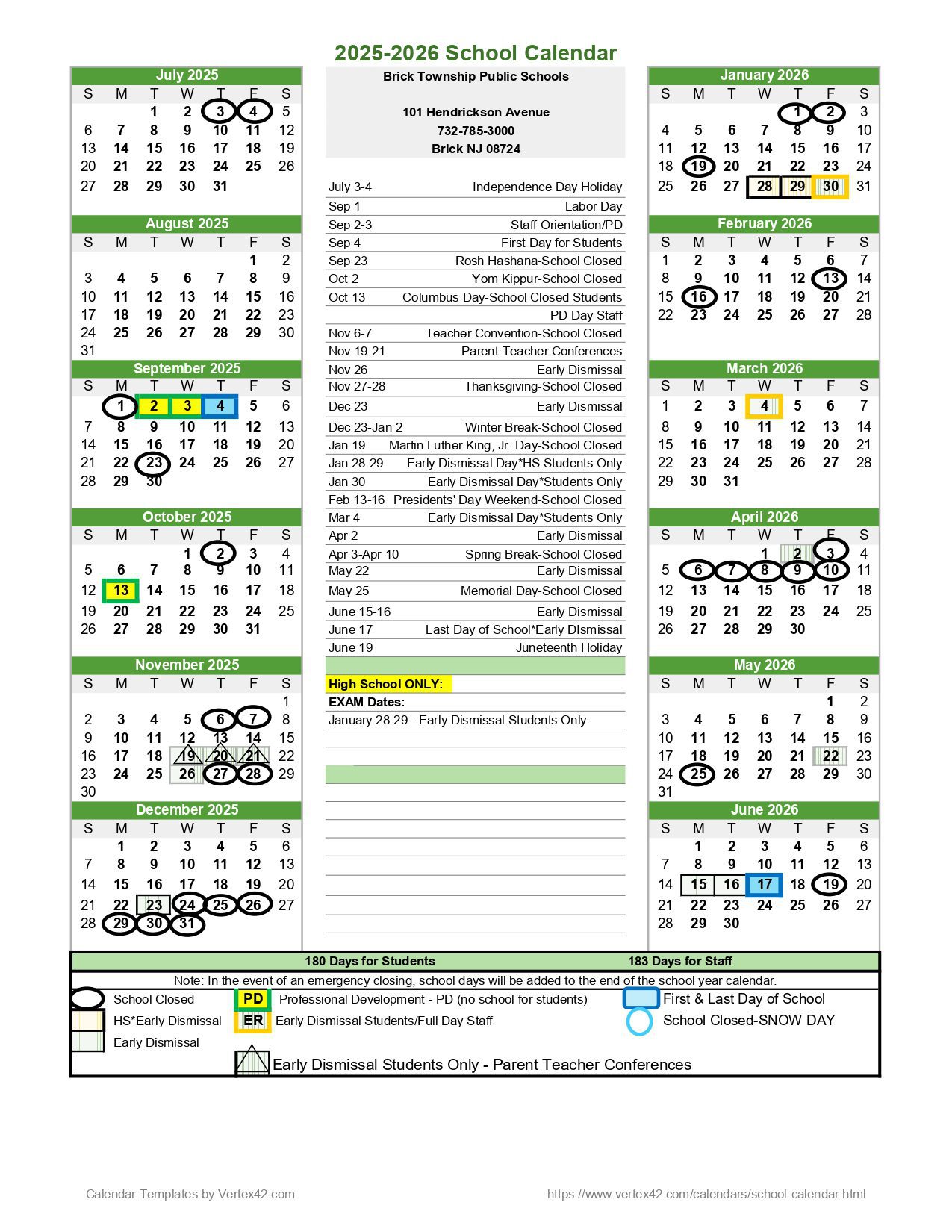 The printable school calendar provided on this page is taken from the official Brick Township School Calendar 25-26 District website. Please note that all dates and events are subject to change at the discretion of the school district. For the most accurate and updated information, please refer to the official district website or contact the school helpline.