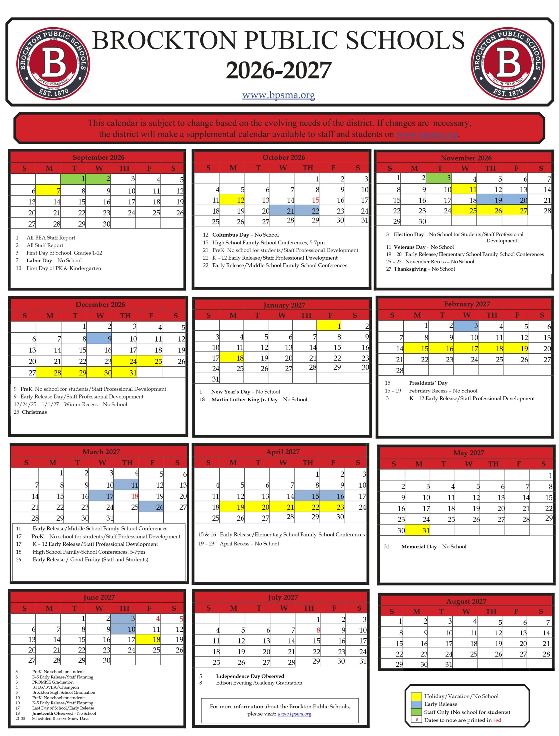 Dates are sourced from the official Brockton Public Schools ma Calendar 26-27 [PDF] website. Dates may change at the discretion of the district. Always verify with the official school website for the latest updates.