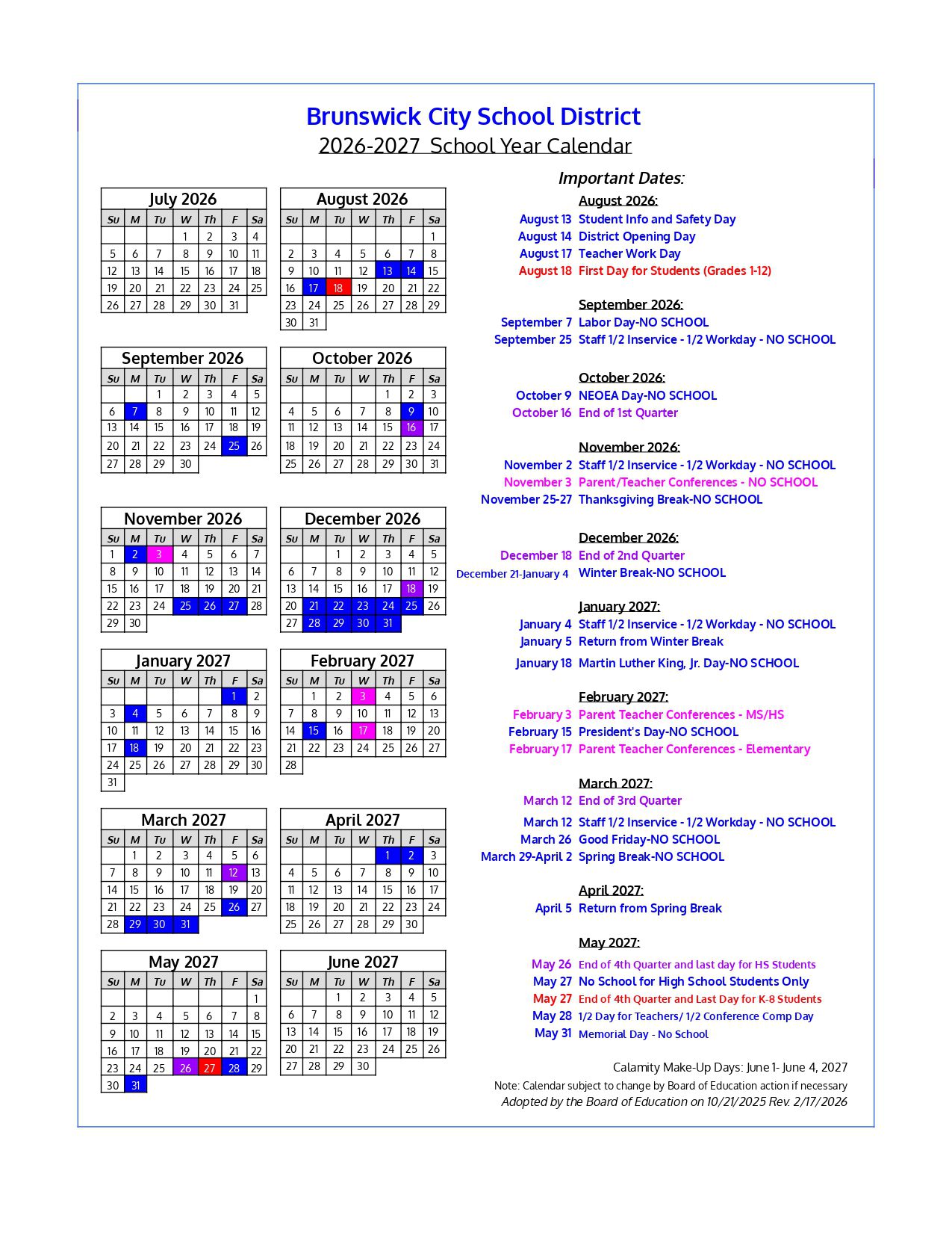 Dates are sourced from the official Brunswick City School District Calendar 26-27 Updates website. Dates may change at the discretion of the district. Always verify with the official school website for the latest updates.