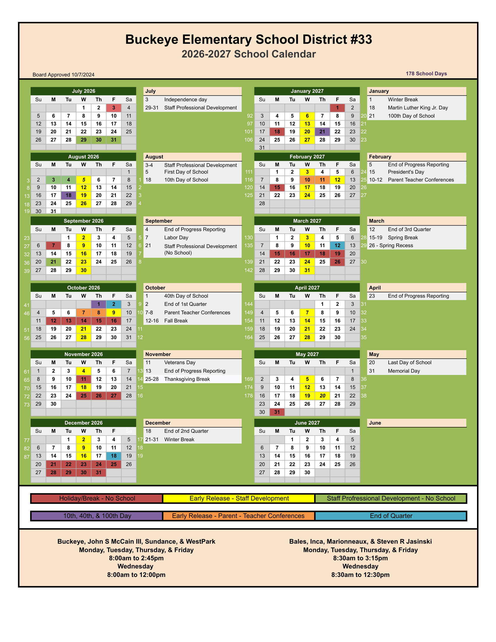 Dates are sourced from the official Buckeye Elementary School District #33 Calendar 26-27 Revised website. Dates may change at the discretion of the district. Always verify with the official school website for the latest updates.