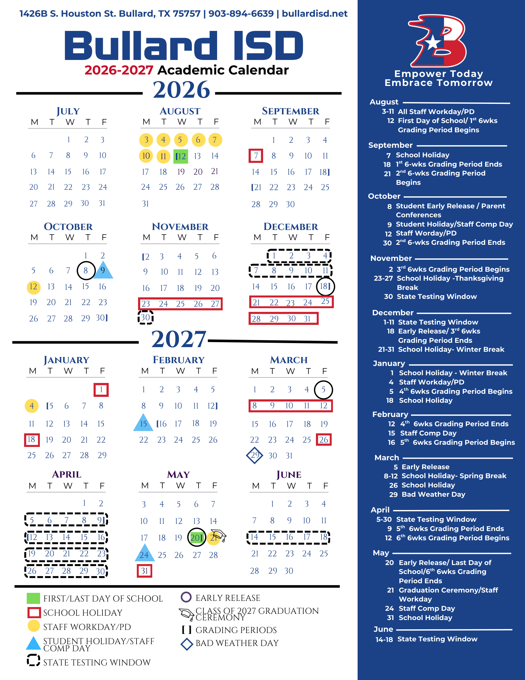 The Printable school calendar provided on this page is taken from the official Bullard ISD Independent School District Calendar 26-27 . Please note that all dates and events are subject to change at the discretion of the school district. For the most accurate and updated information, please refer to the official district website or contact the school helpline.
