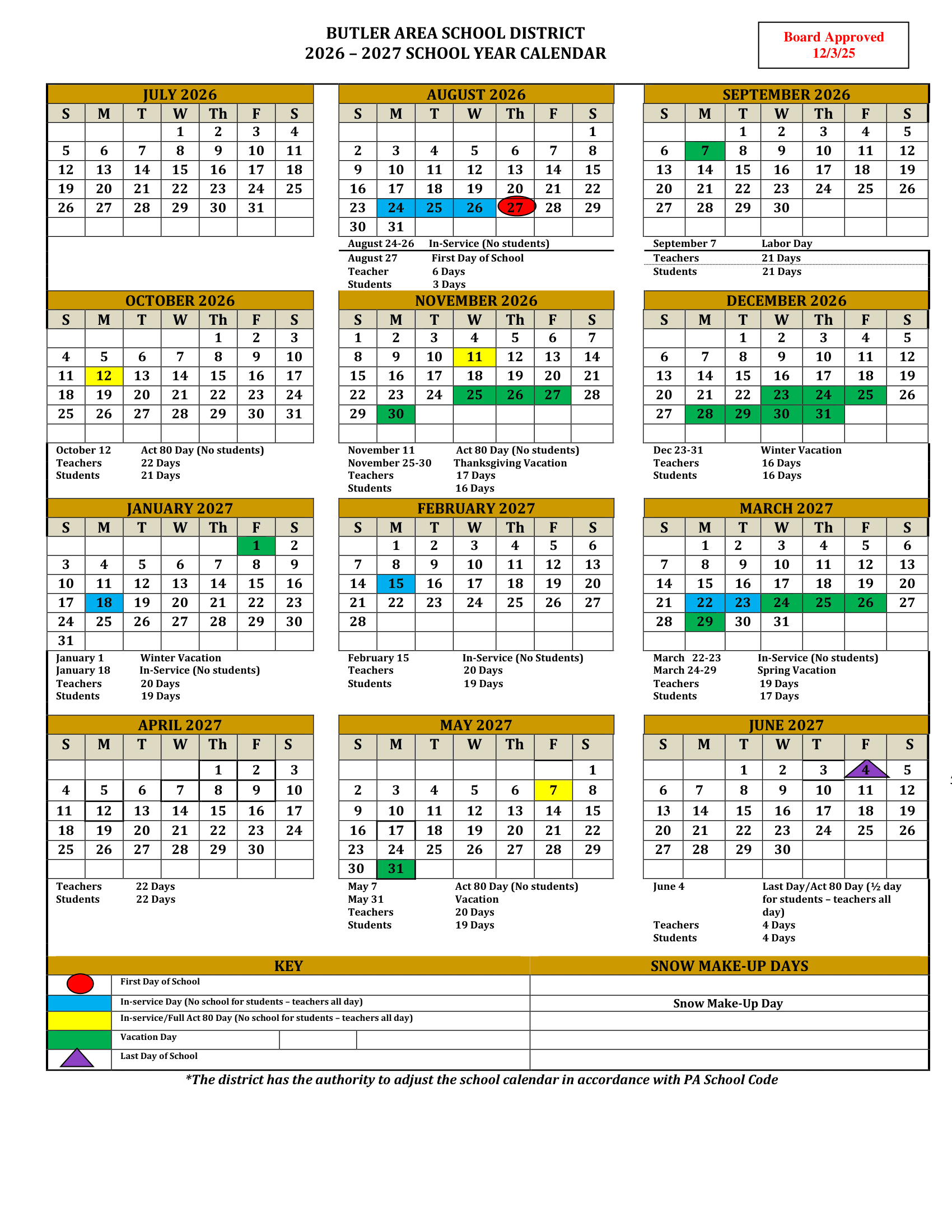 Dates are sourced from the official Butler Area School District 26-27 Calendar Updated [PDF] website. Dates may change at the discretion of the district. Always verify with the official school website for the latest updates.