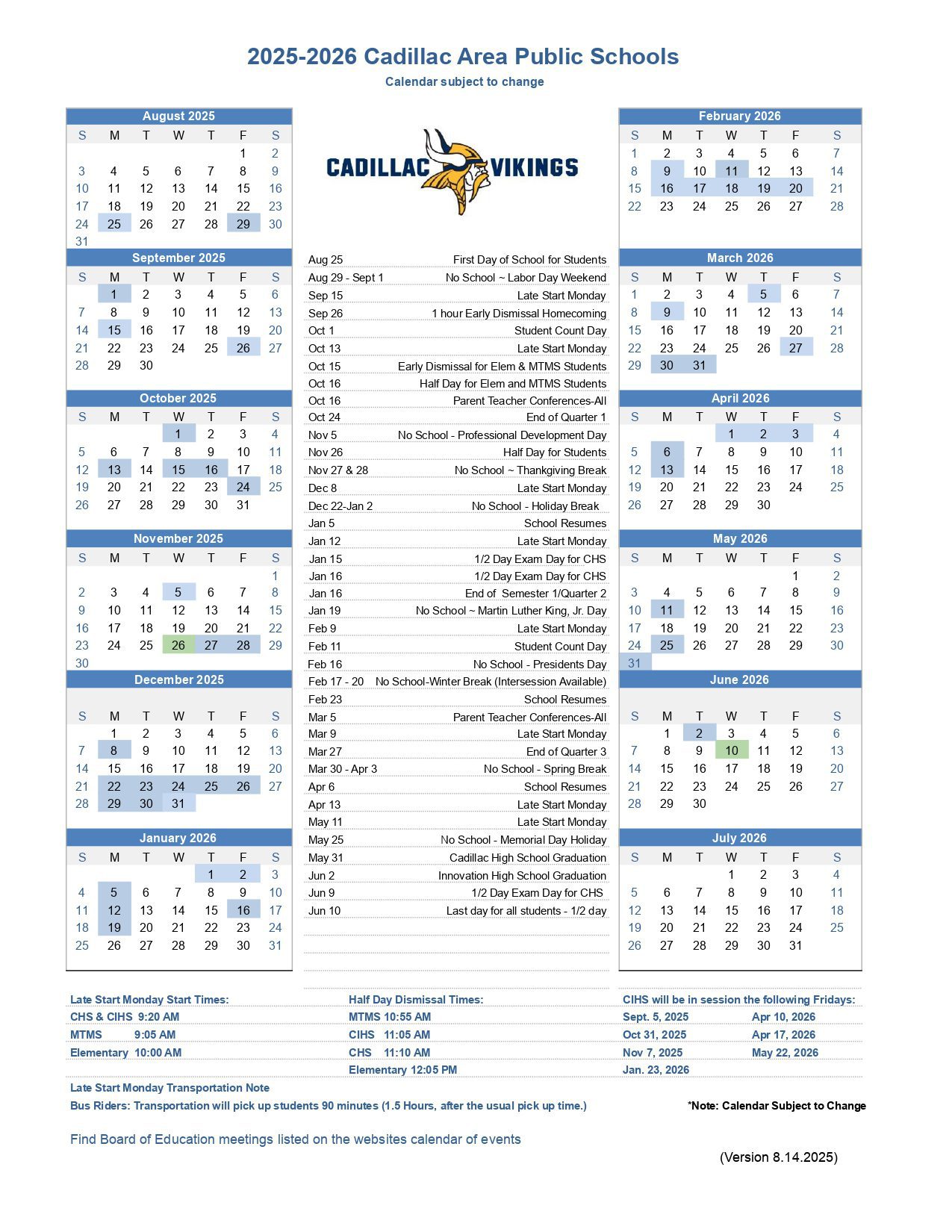 Cadillac Area Public Schools Calendar (2025-2026)