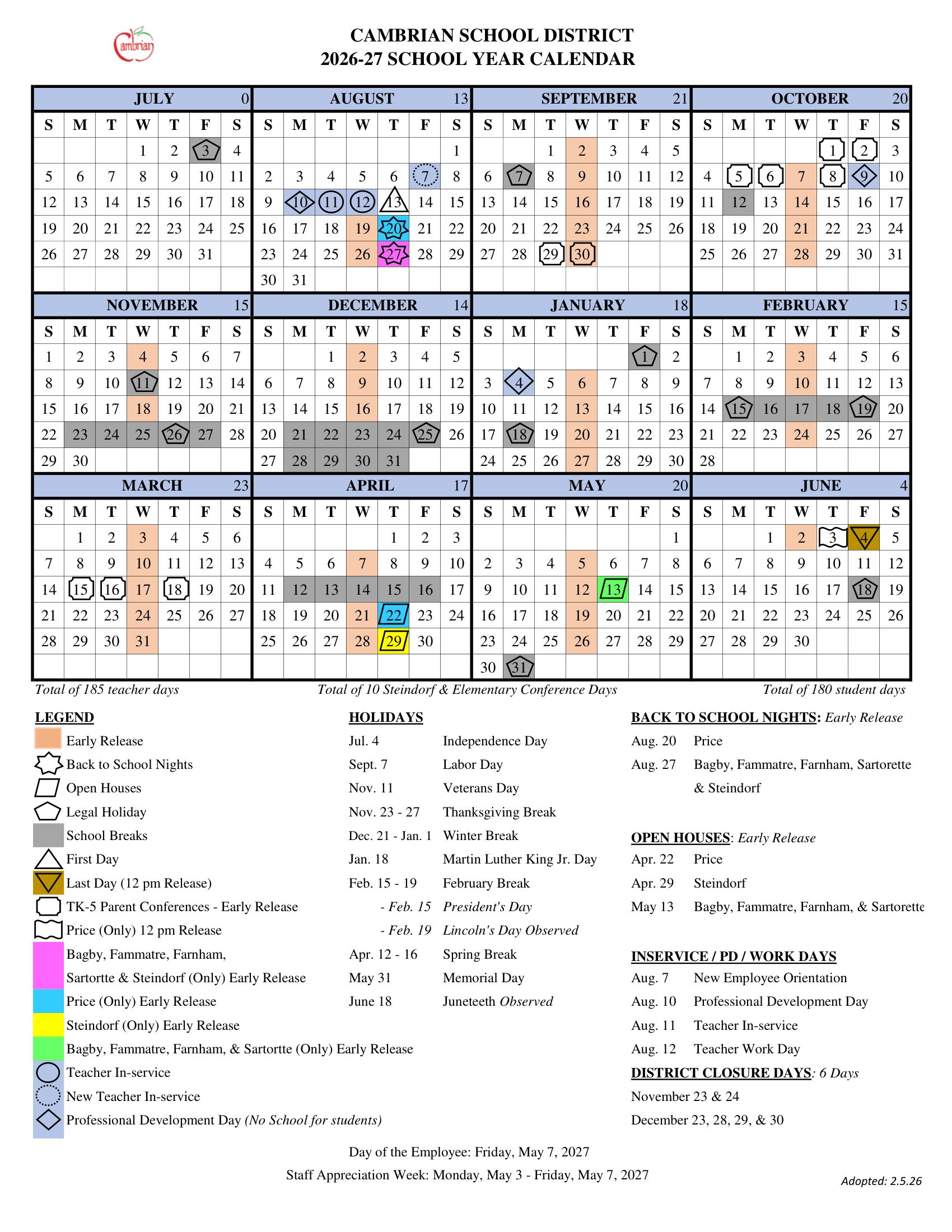 Dates are sourced from the official Cambrian School District 26-27 Calendar [PDF] website. Dates may change at the discretion of the district. Always verify with the official school website for the latest updates.
